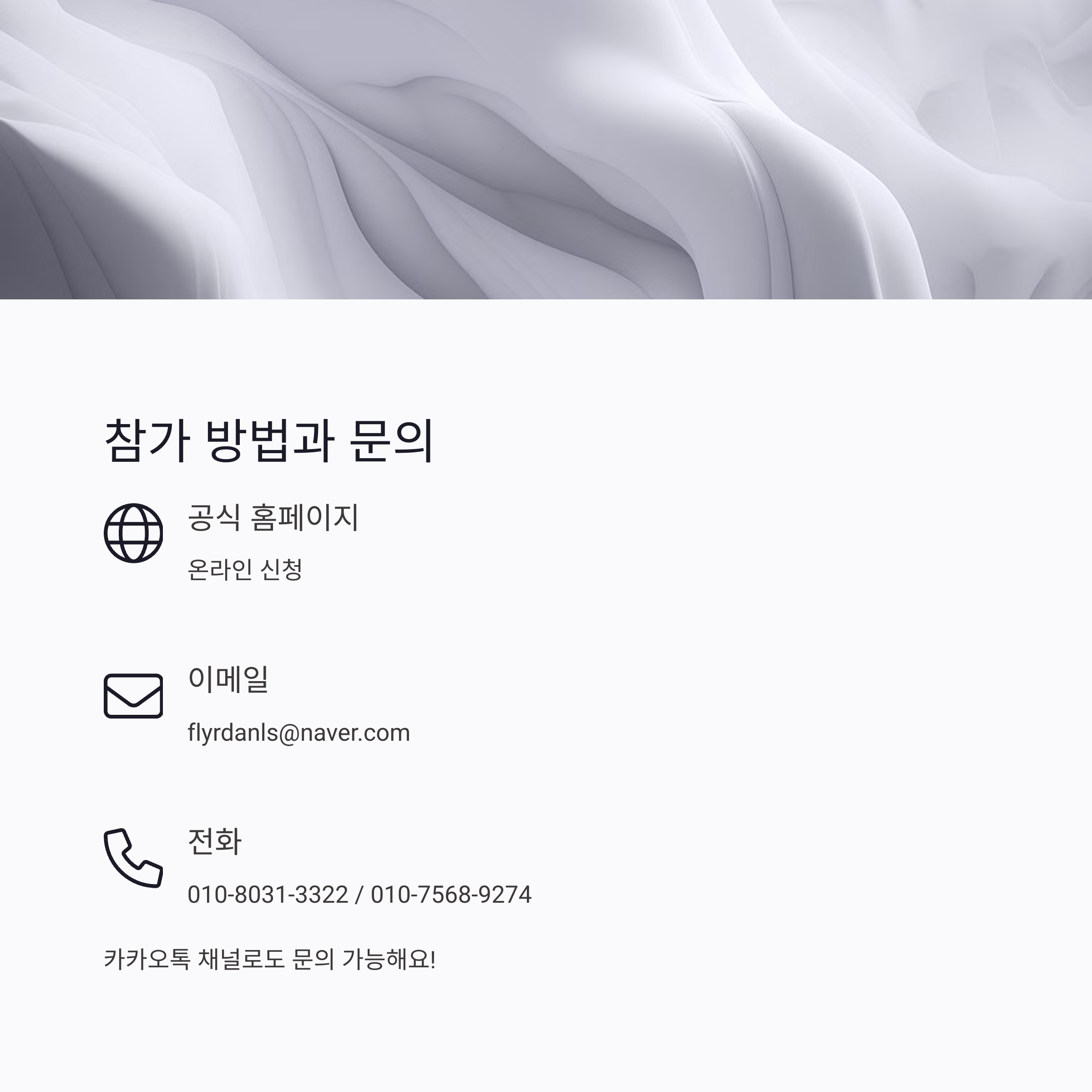 문의는 이메일(flyrdanls@naver.com) 또는 전화(010-8031-3322 / 010-7568-9274)로 할 수 있습니다.