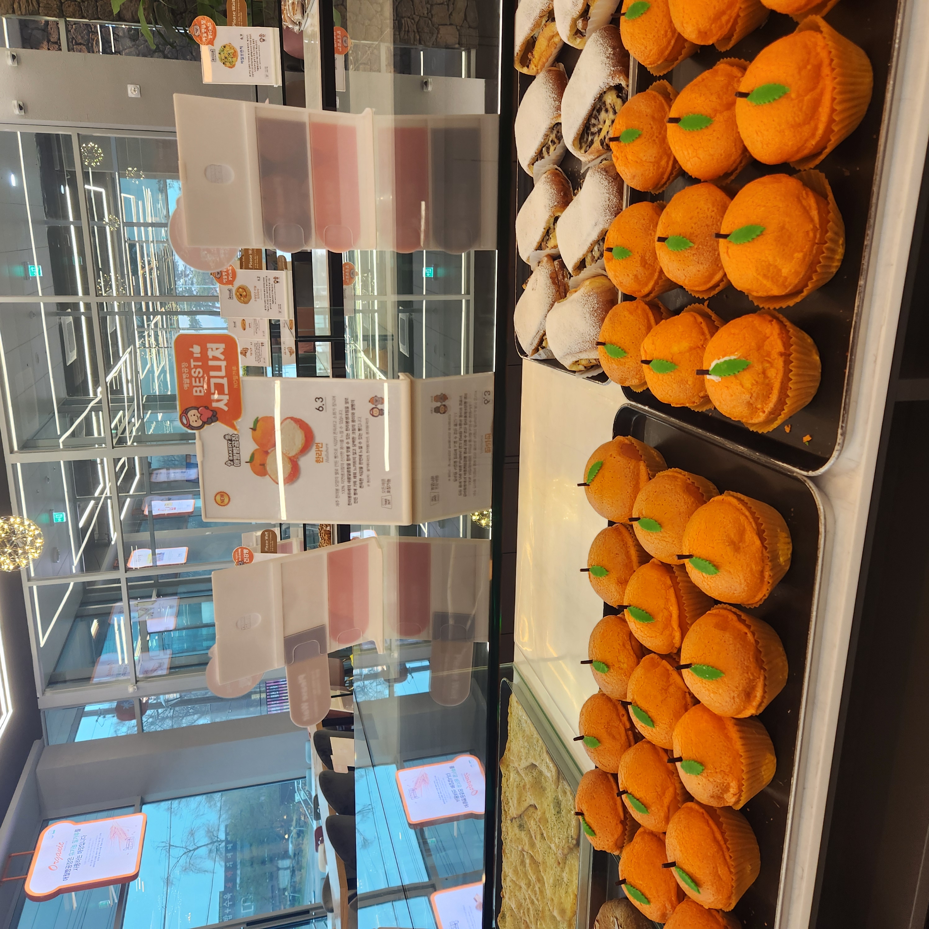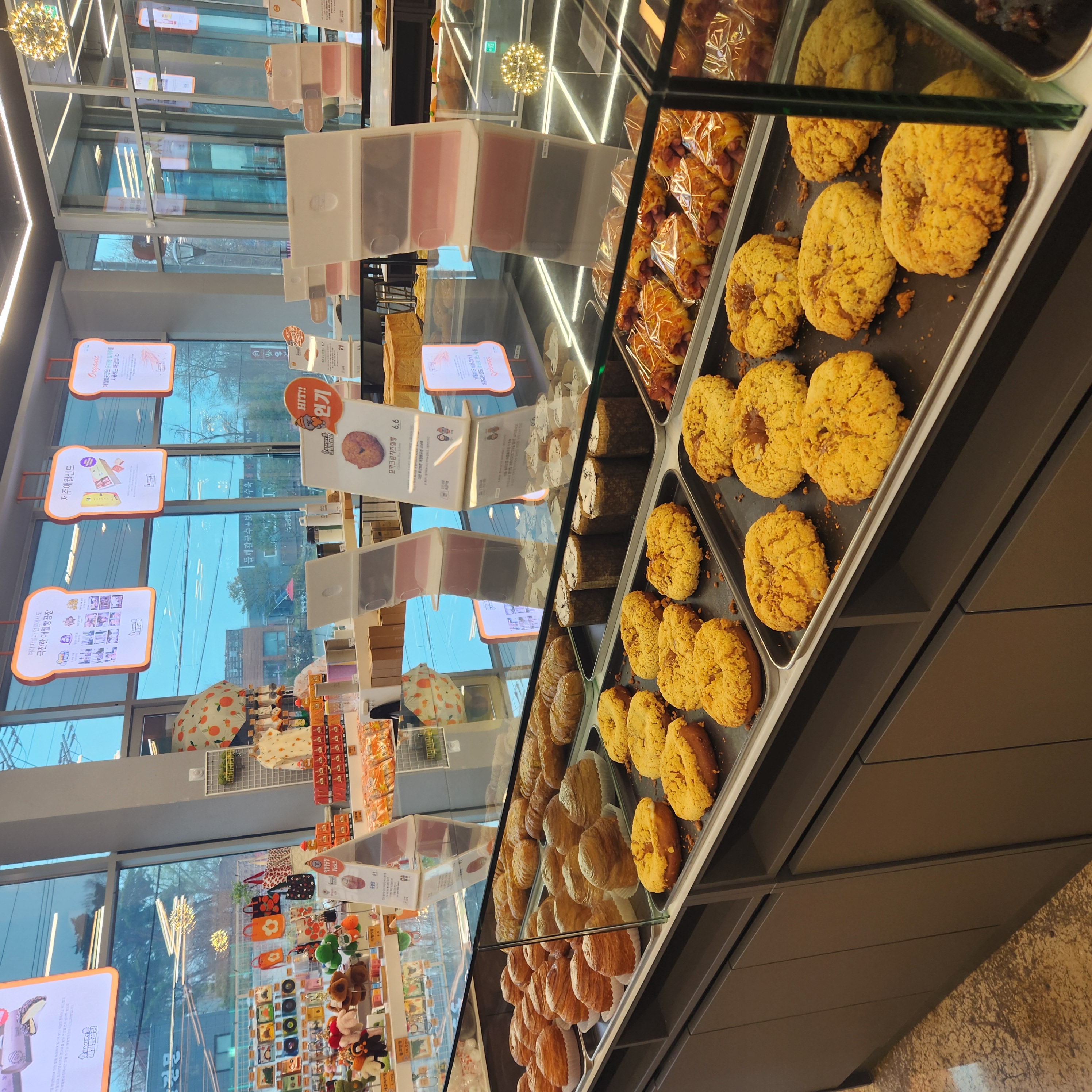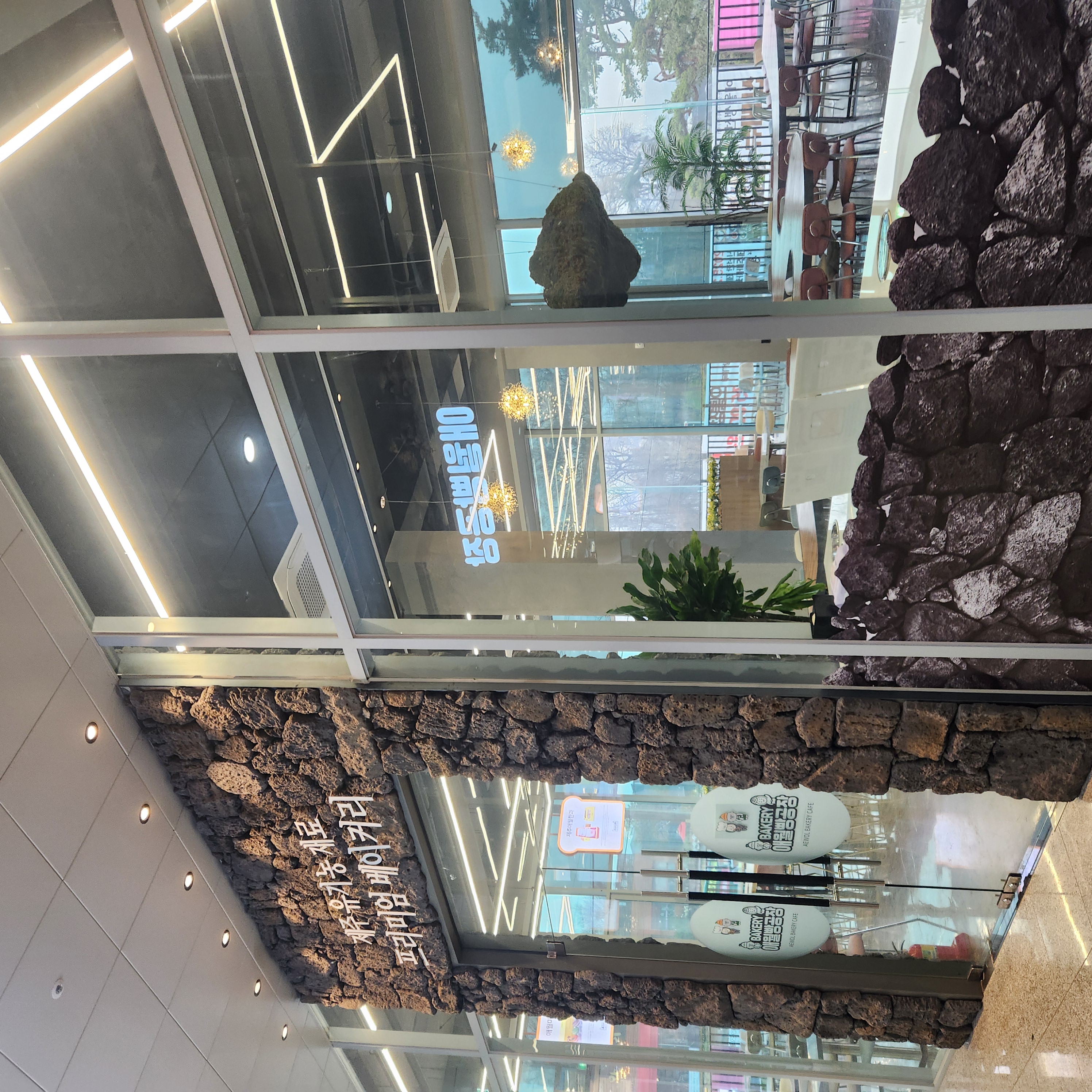 매장 외관부터 제주도의 감성을 그대로 담아낸 듯한 분위기가 인상적이었어요. 입구는 마치 제주 돌담을 연상케 하는 검은색 현무암 스타일로 꾸며져 있어서, 들어서자마자 제주도에 온 듯한 기분! 내부는 넓고 쾌적하며, 곳곳에 제주를 연상시키는 소품들이 배치되어 있어 마치 제주 여행을 온 듯한 기분이 들었답니다. 베이커리 진열대도 다양하게 꾸며져 있어서 고르는데 시간이 꽤 걸렸어요.