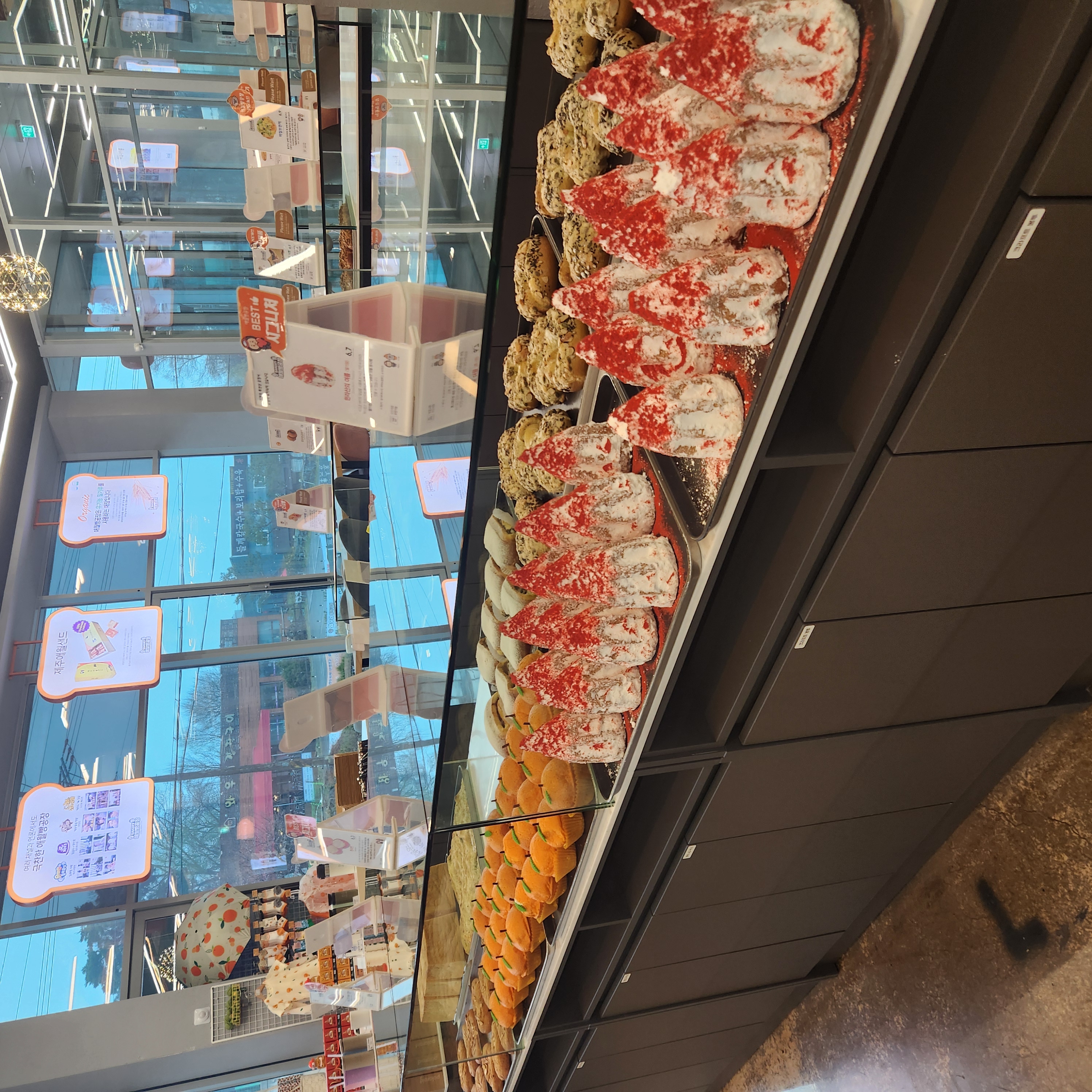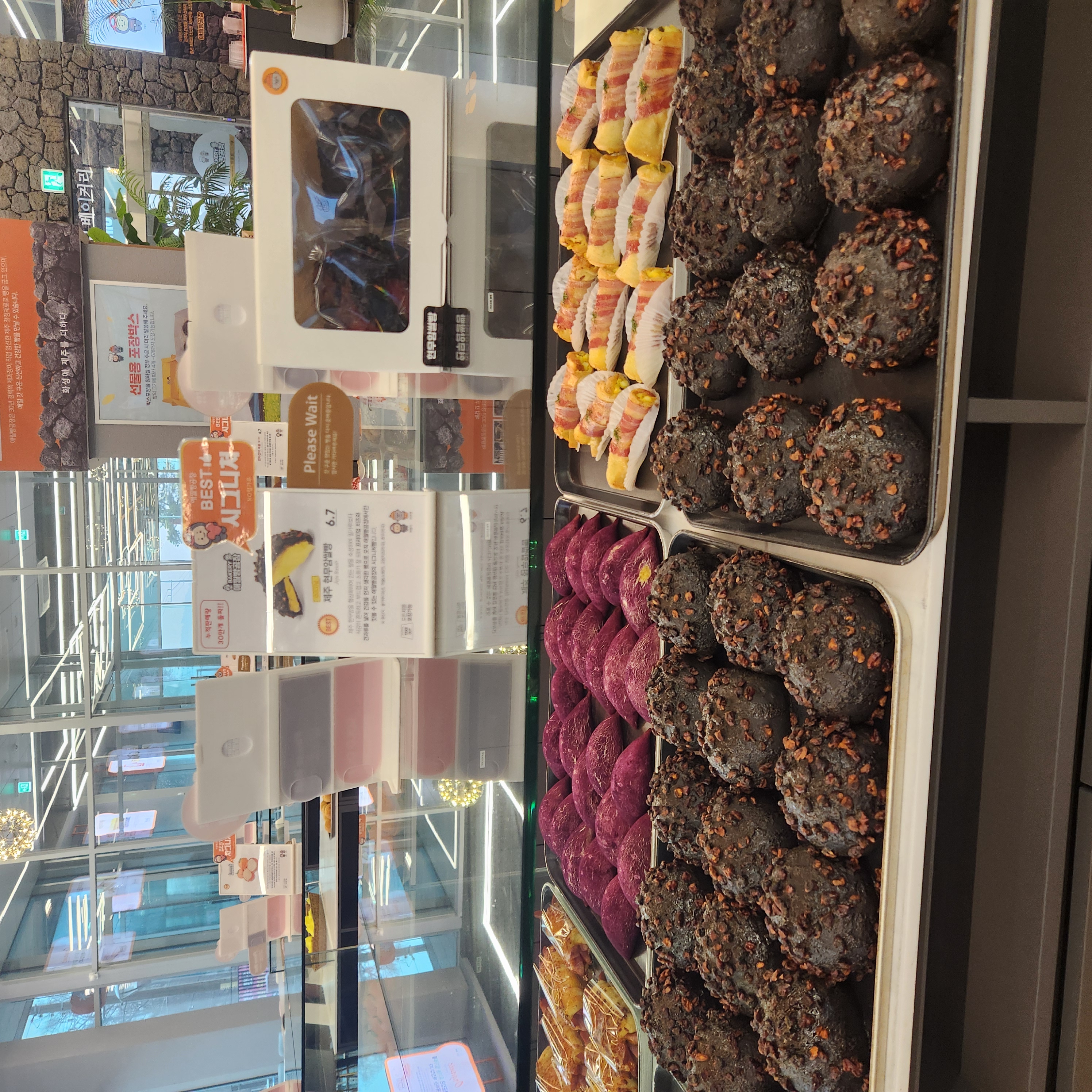 매장 외관부터 제주도의 감성을 그대로 담아낸 듯한 분위기가 인상적이었어요. 입구는 마치 제주 돌담을 연상케 하는 검은색 현무암 스타일로 꾸며져 있어서, 들어서자마자 제주도에 온 듯한 기분! 내부는 넓고 쾌적하며, 곳곳에 제주를 연상시키는 소품들이 배치되어 있어 마치 제주 여행을 온 듯한 기분이 들었답니다. 베이커리 진열대도 다양하게 꾸며져 있어서 고르는데 시간이 꽤 걸렸어요.