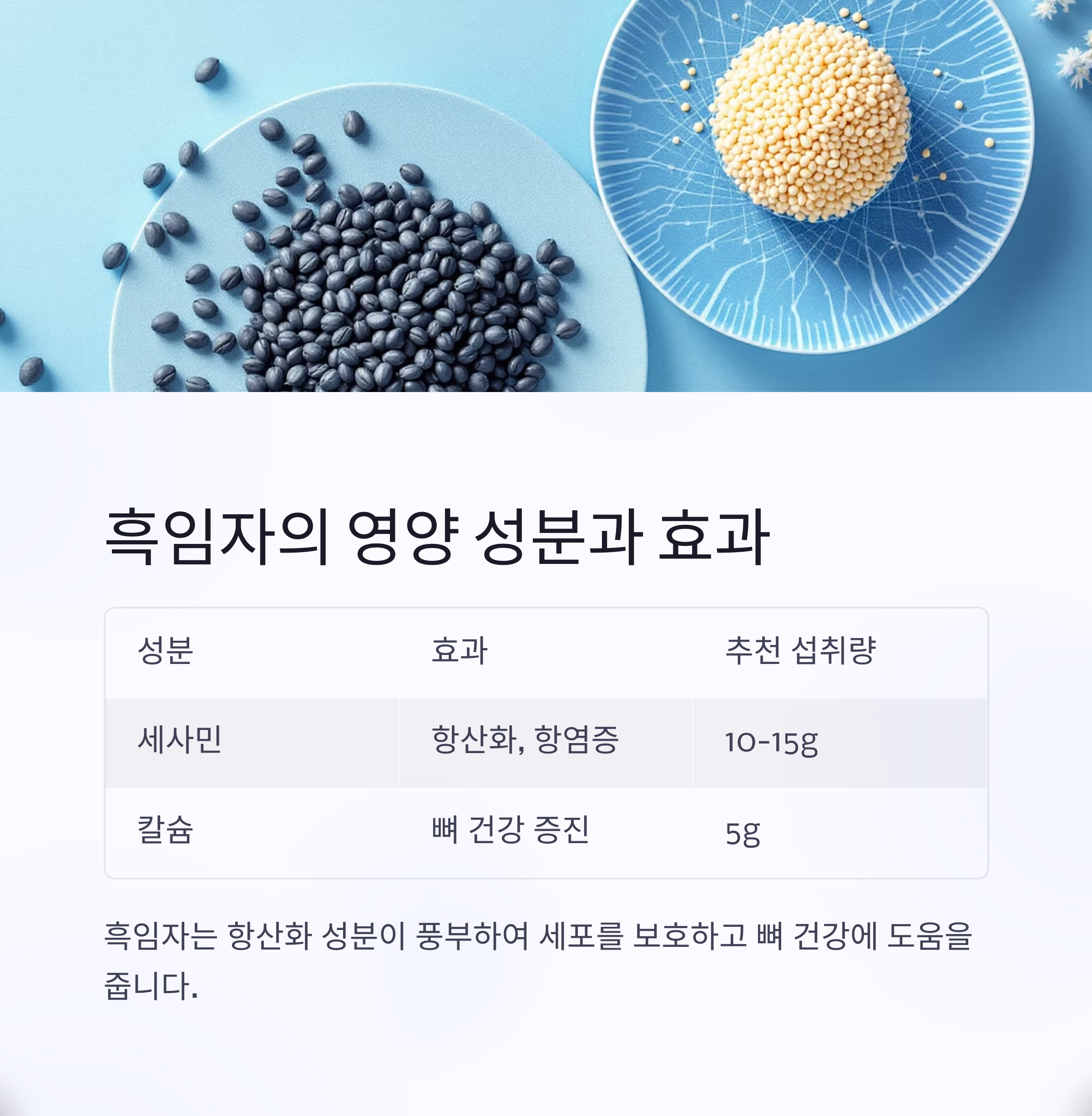 흑임자는 칼슘과 철분이 풍부해 뼈건강에 이롭고, 오메가-3 지방산이 뇌 건강에도 작용합니다.