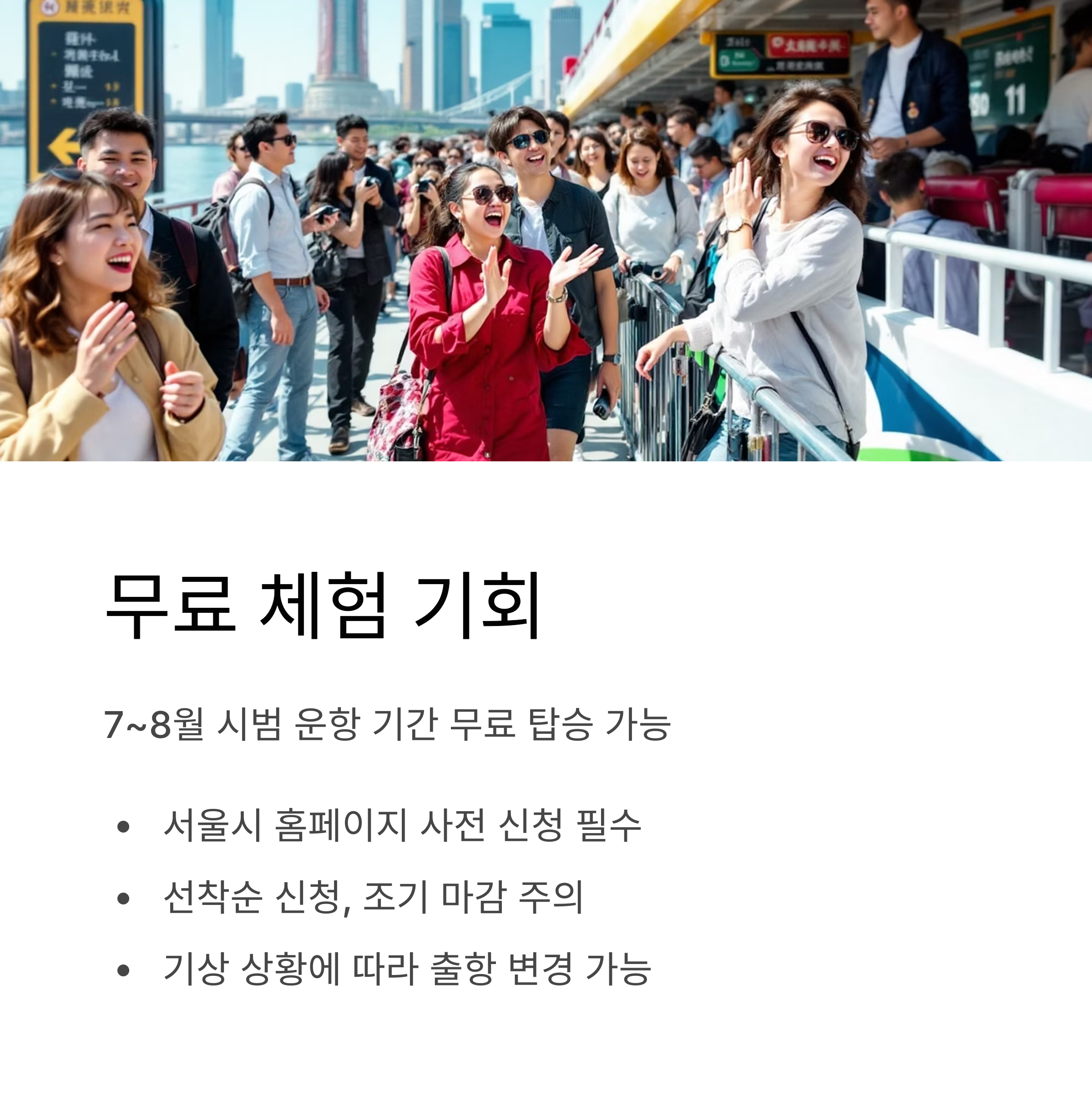 시범 운항 기간(7~8월)에는 무료로 탑승 체험이 가능하며, 서울시 홈페이지에서 사전 신청해야만 이용할 수 있습니다. 체험은 선착순 신청으로 진행되며, 각 회차별 정원이 있으니 조기 마감에 유의하시기 바랍니다.