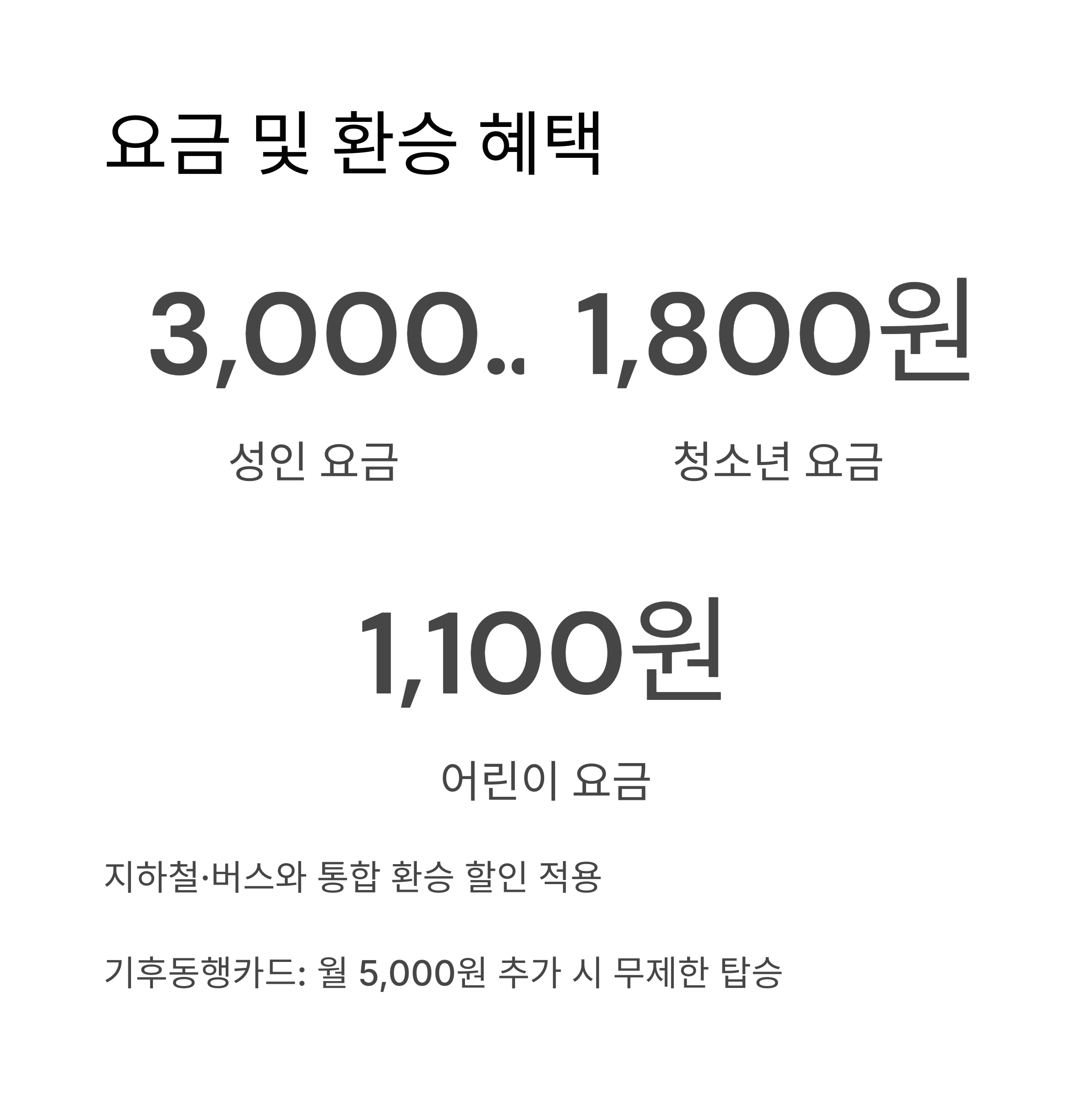 - 환승 할인: 서울 지하철·버스와 통합 환승 할인 적용