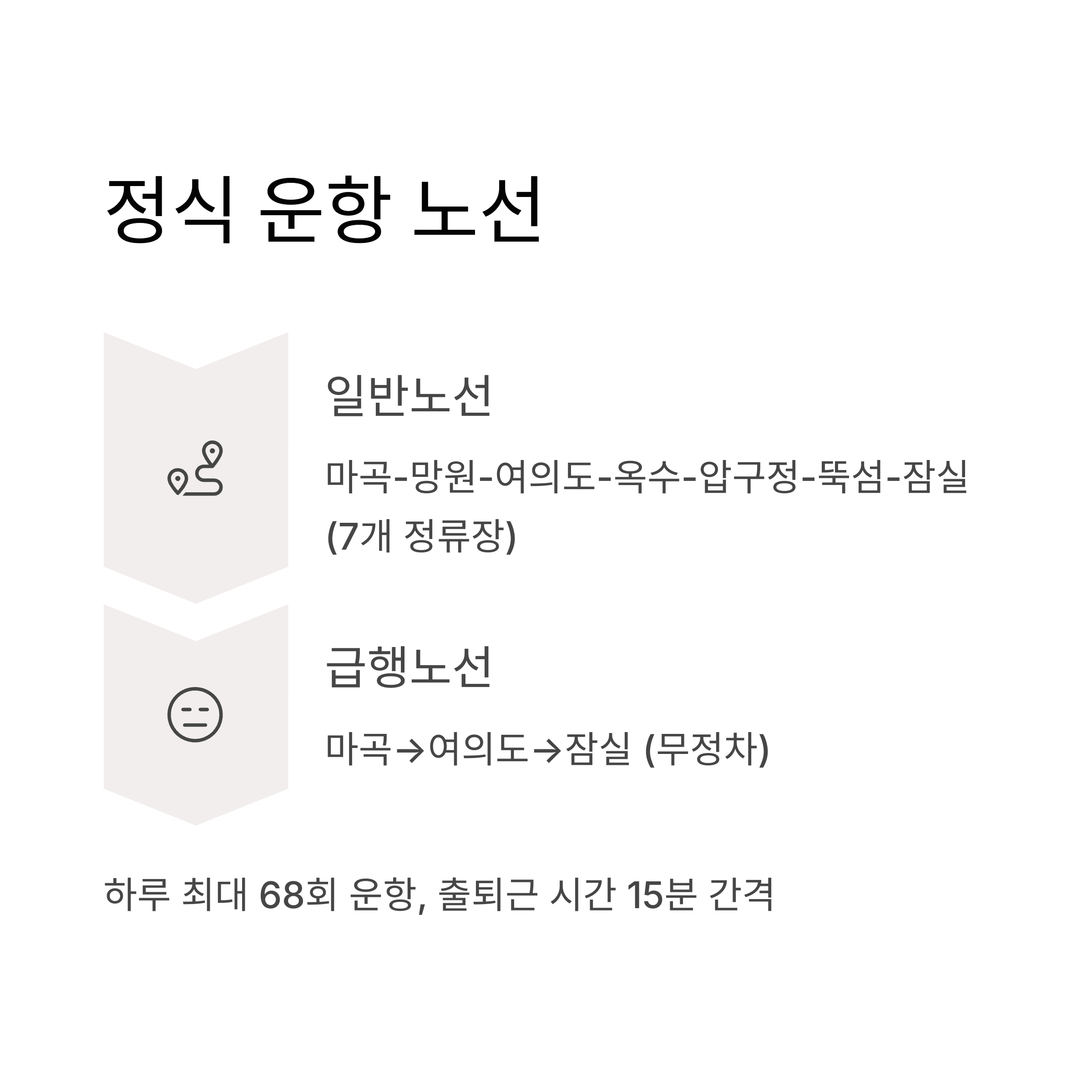 - 운항 노선: 여의도 → 뚝섬 → 잠실 (편도, 중간 무정차)