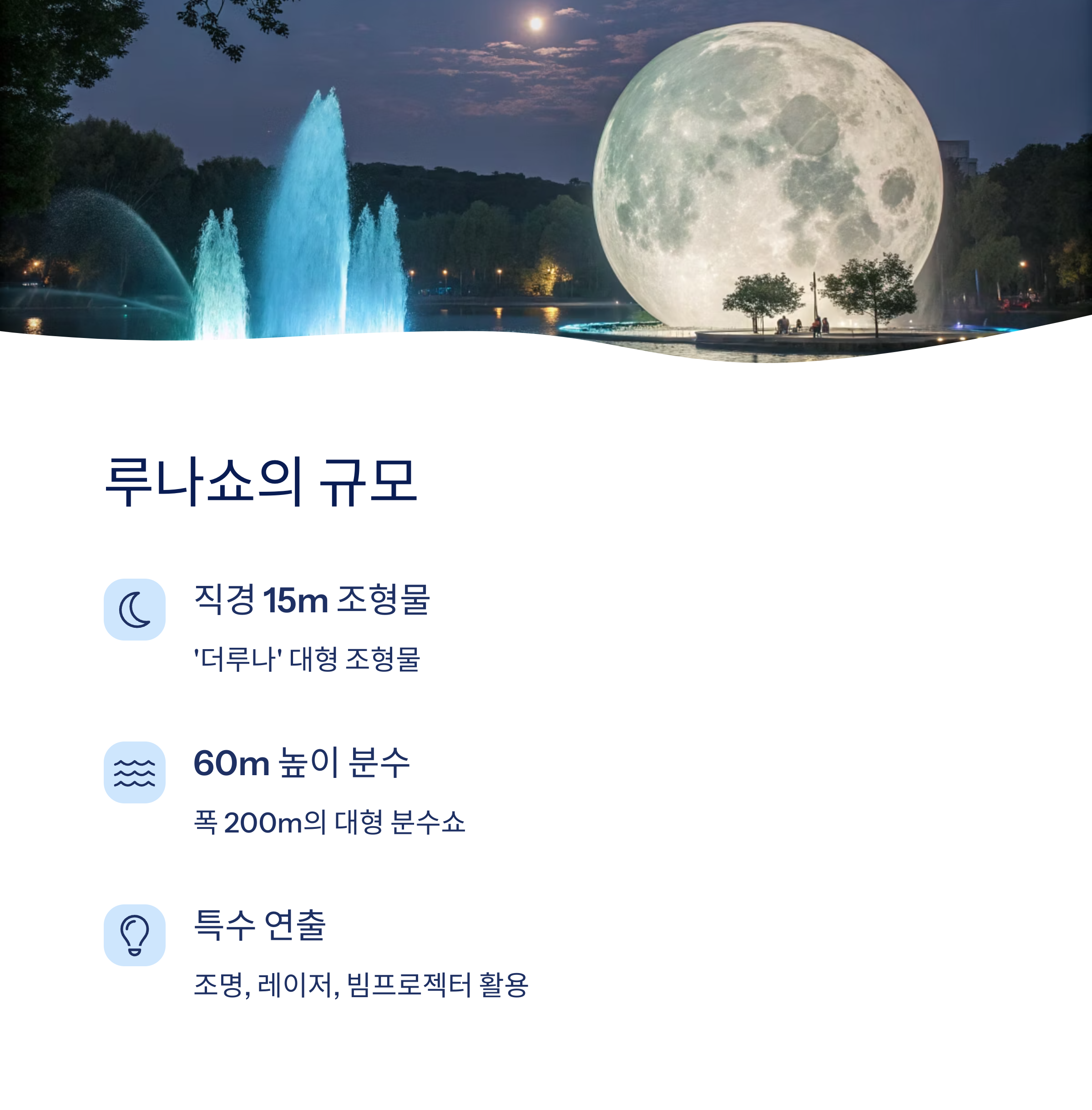 • 압도적 규모: 15m 조형물, 60m 높이 분수, 200m 폭의 물줄기, 특수 조명과 레이저, 빔프로젝터 연출