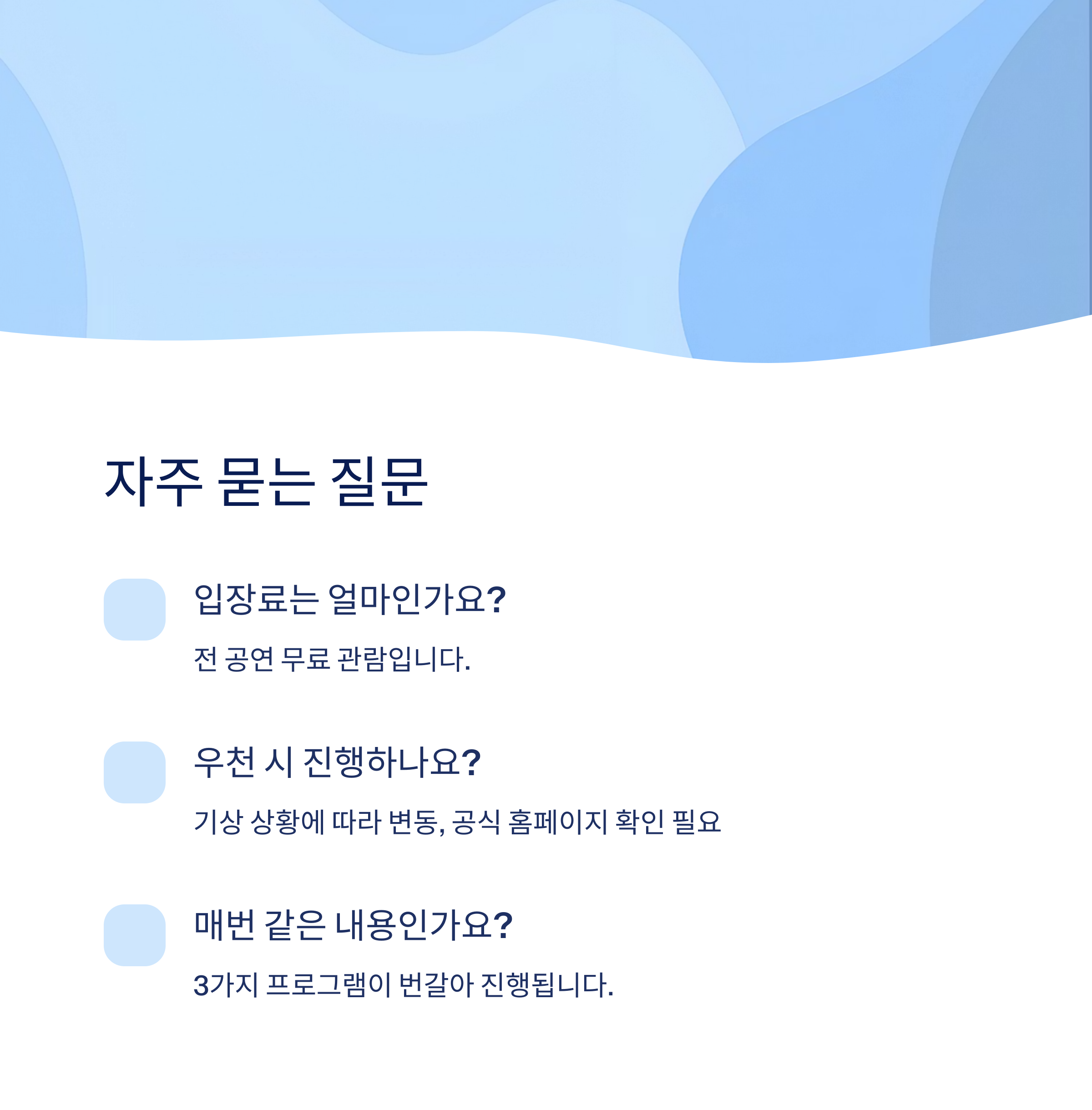 A. 기상 상황에 따라 변동될 수 있으니, 당일 공식 홈페이지나 동탄호수공원 SNS를 참고하세요.