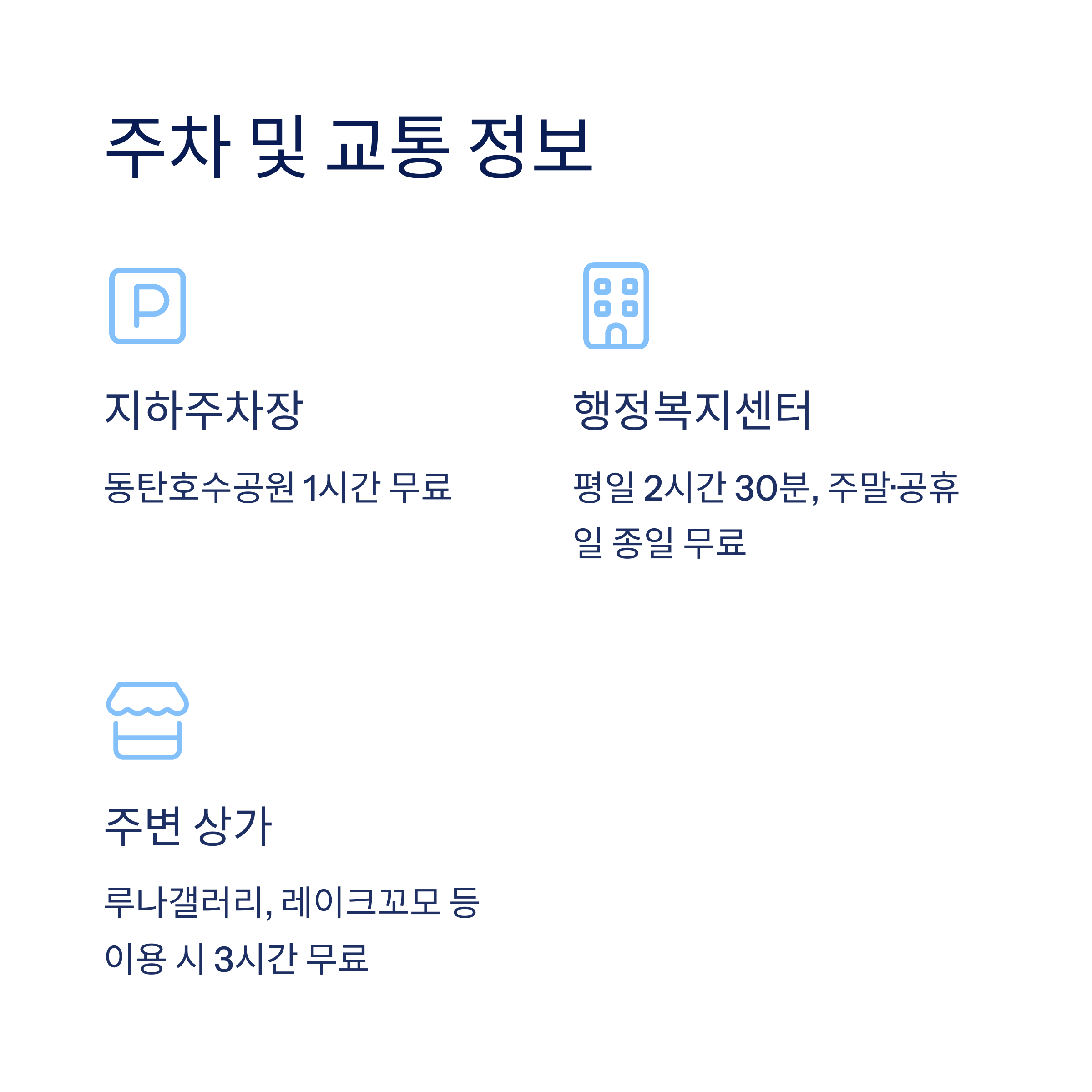 • 주변 상가(루나갤러리, 레이크꼬모 등): 상가 이용 시 3시간 무료