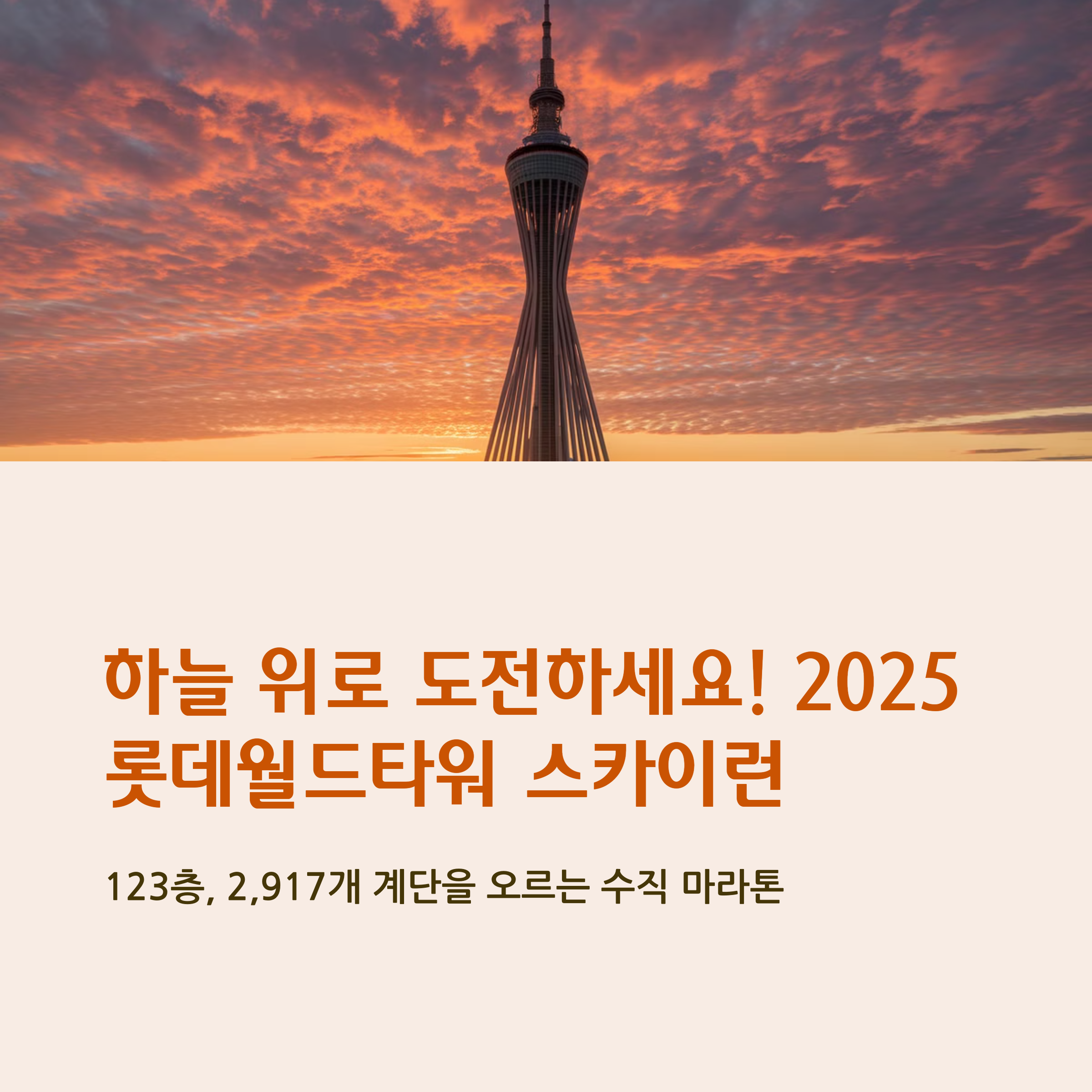 2025 롯데월드타워 스카이런은 123층, 총 2,917계단을 오르는 국내 유일의 수직 마라톤 대회로, 심장을 뛰게 하는 도전 정신과 짜릿한 성취감을 동시에 안겨줍니다.