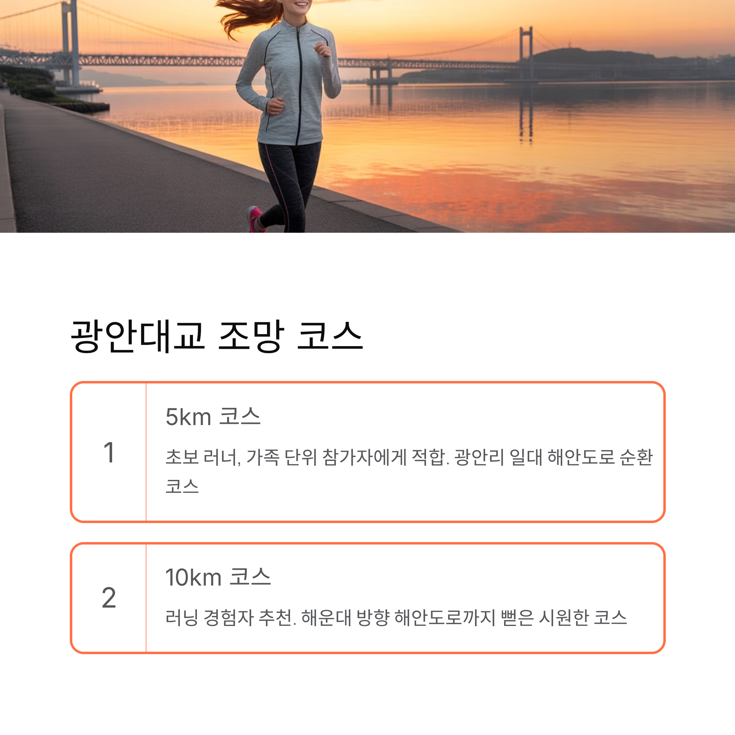 - 5km 코스: 초보 러너, 가족 단위 참가자에게 적합. 광안리 일대 해안도로를 중심으로 구성된 순환 코스