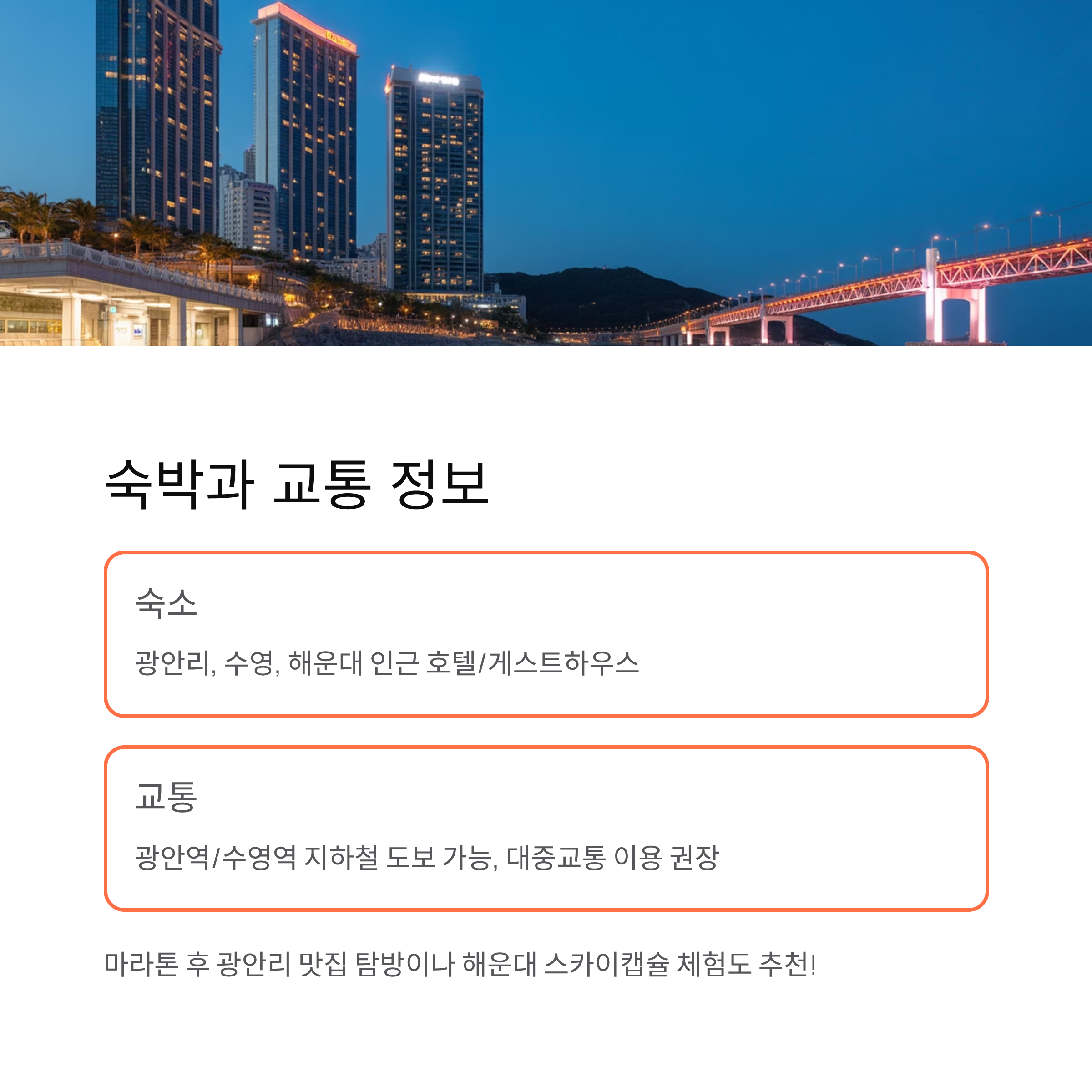 마라톤 후에는 광안리 근처에서 부산의 로컬 맛집 탐방이나 해운대 스카이캡슐 체험도 추천합니다. 여행을 곁들인 마라톤, 충분히 가능합니다.