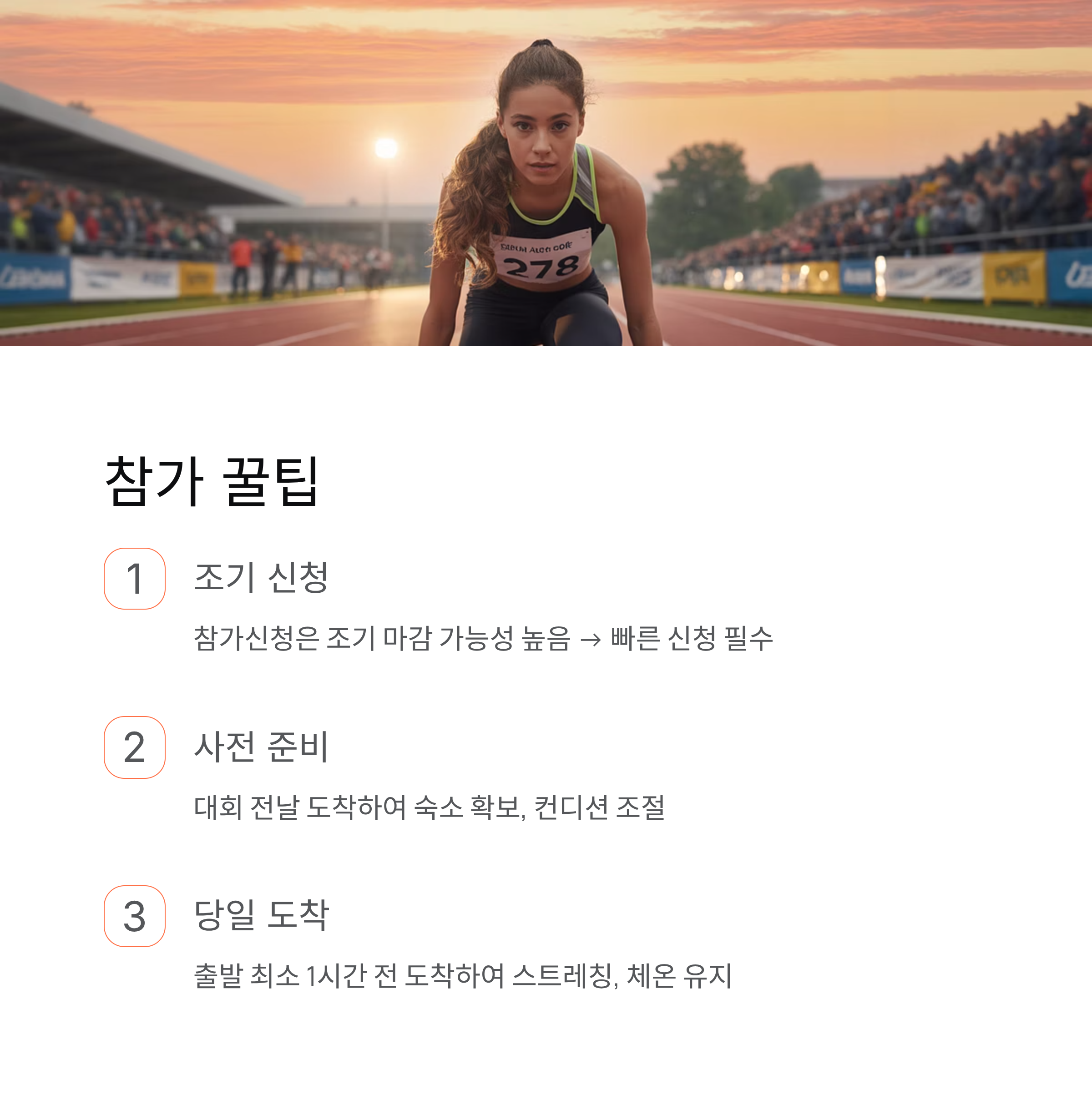 - 출발 최소 1시간 전 도착하여 스트레칭, 체온 유지