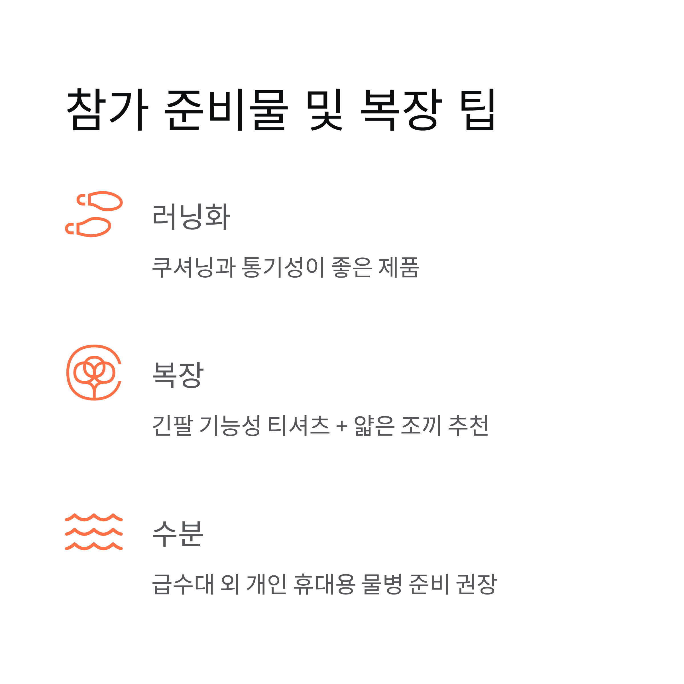 - 수분: 행사장 내 급수대 외에도 개인 휴대용 물병 준비 권장