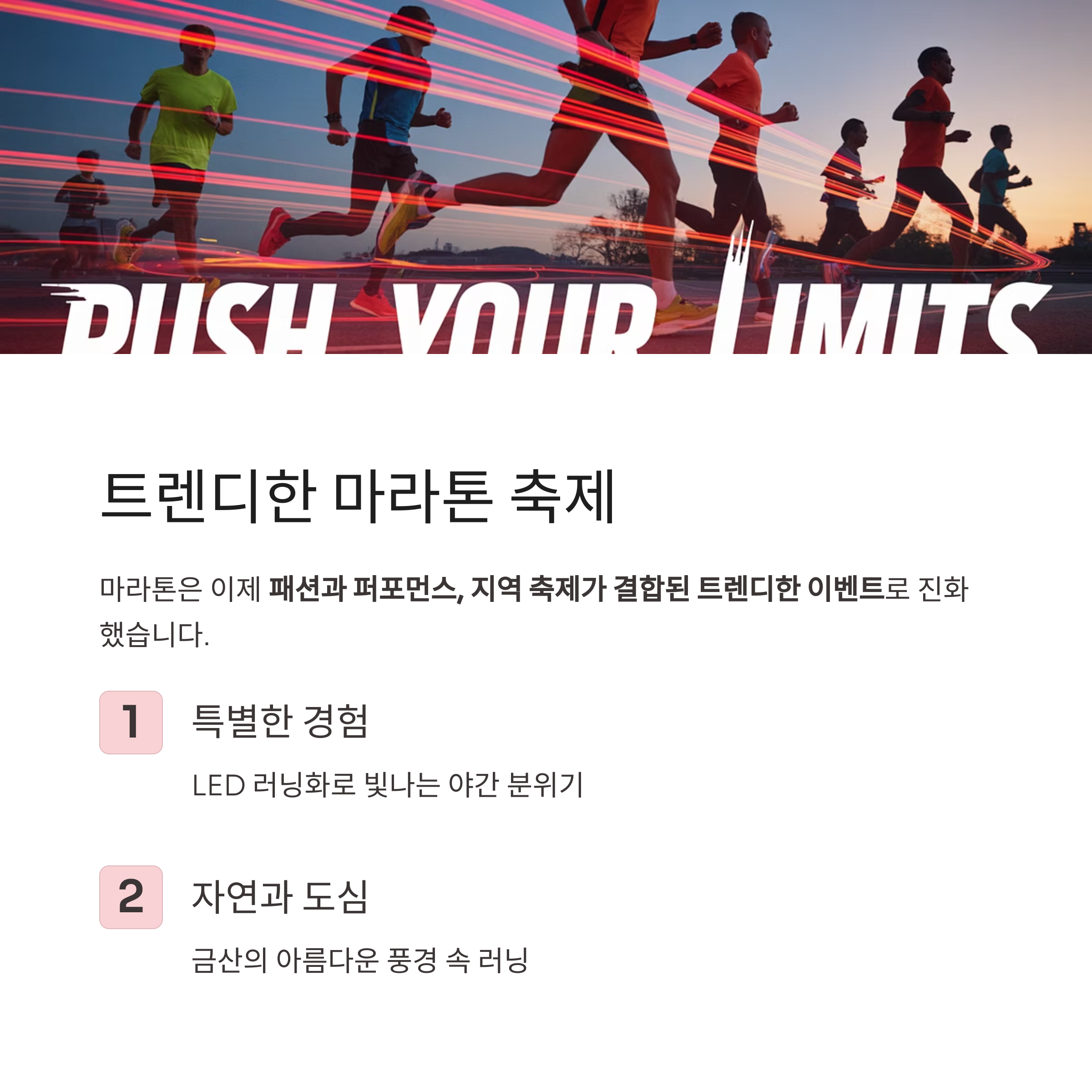 LED 러닝화를 신고 금산 도심과 자연을 달리는 특색 있는 야간 분위기 연출의 마라톤을 지금 만나보세요.