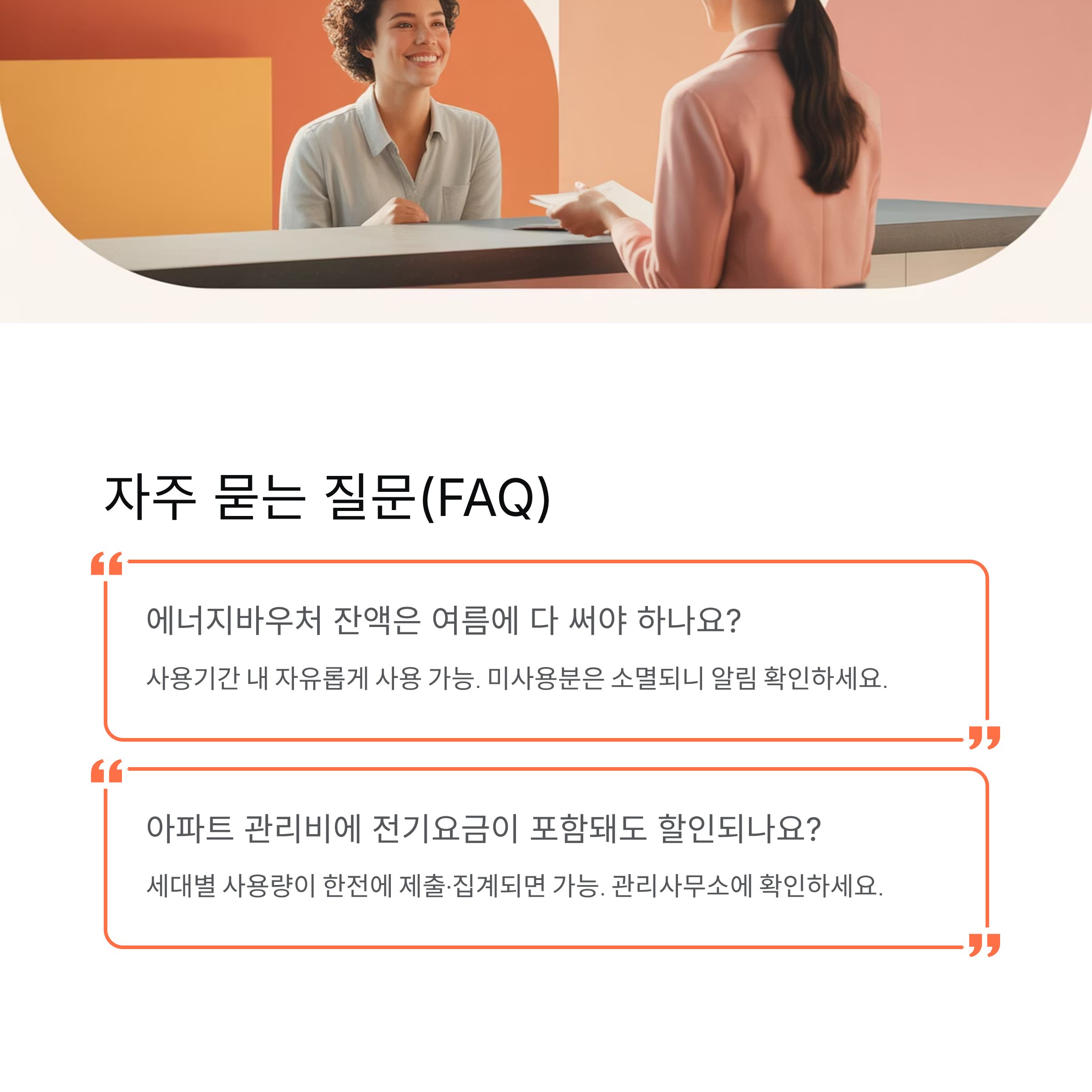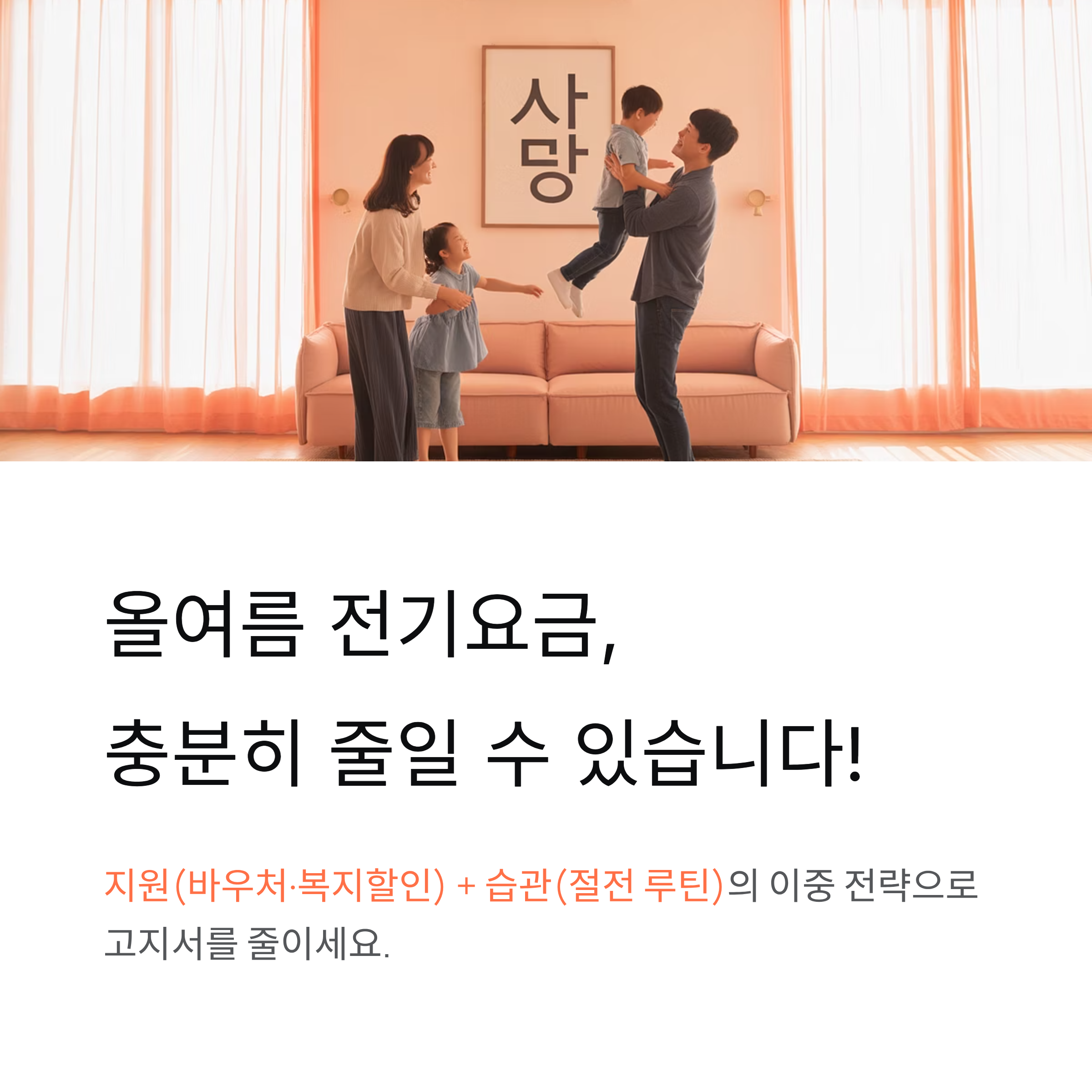 - 바우처(여름 즉시 차감) + 복지할인 + 절전 실천 = 여름철 월 수만 원 절감 가능.