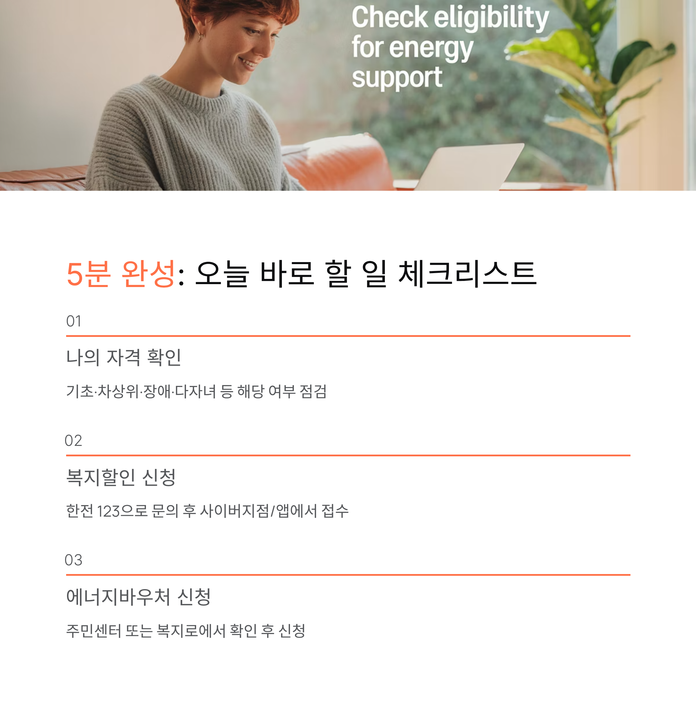 - 신청 창구: 에너지바우처는 주민센터·복지로 등, 복지할인은 한전 고객센터 123 / 사이버지점에서 가능.