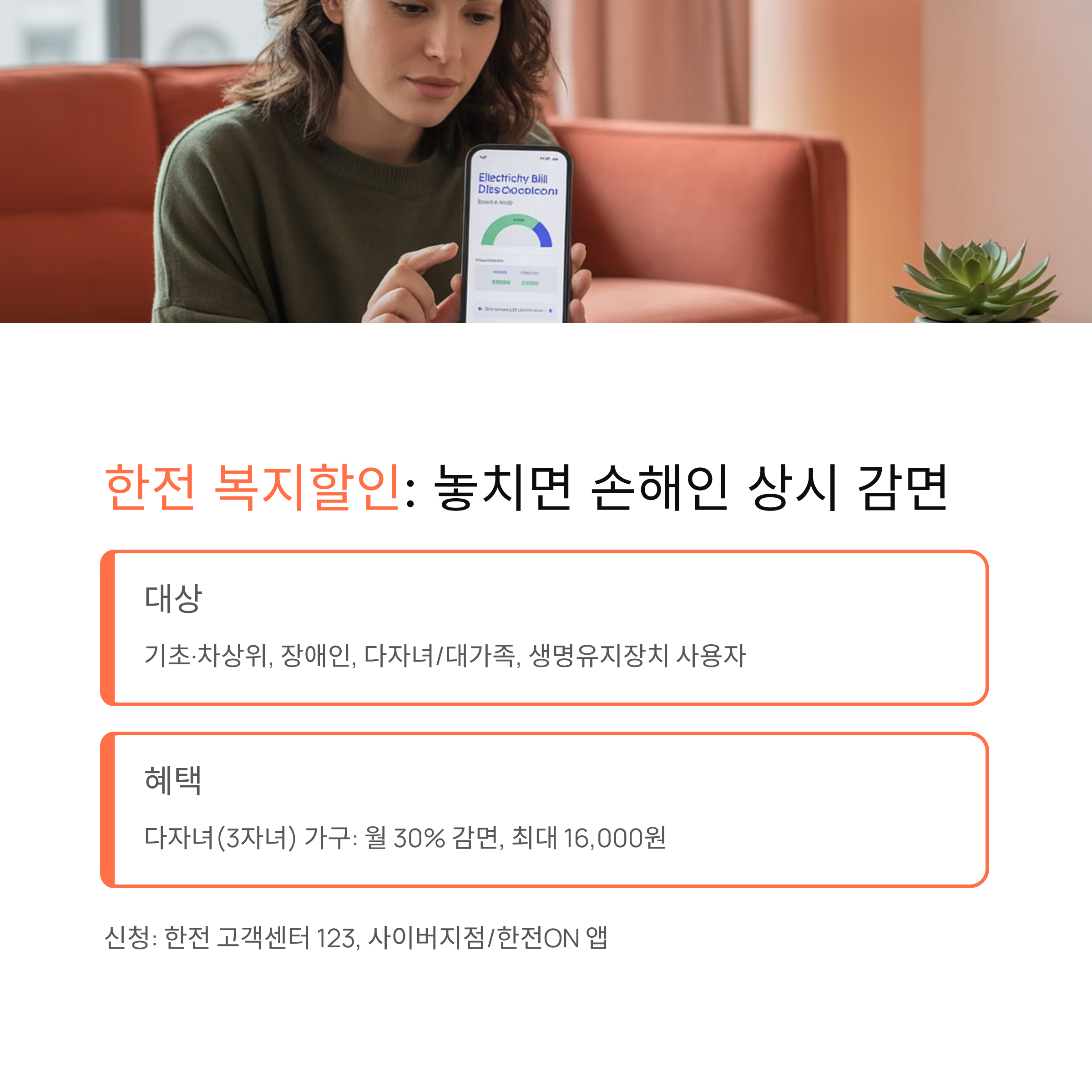 - 다자녀(3자녀) 가구: 월 30% 감면, 최대 16,000원(서울시 안내 기준, 전국 적용 세부는 한전 심사·계약유형에 따라 상이).