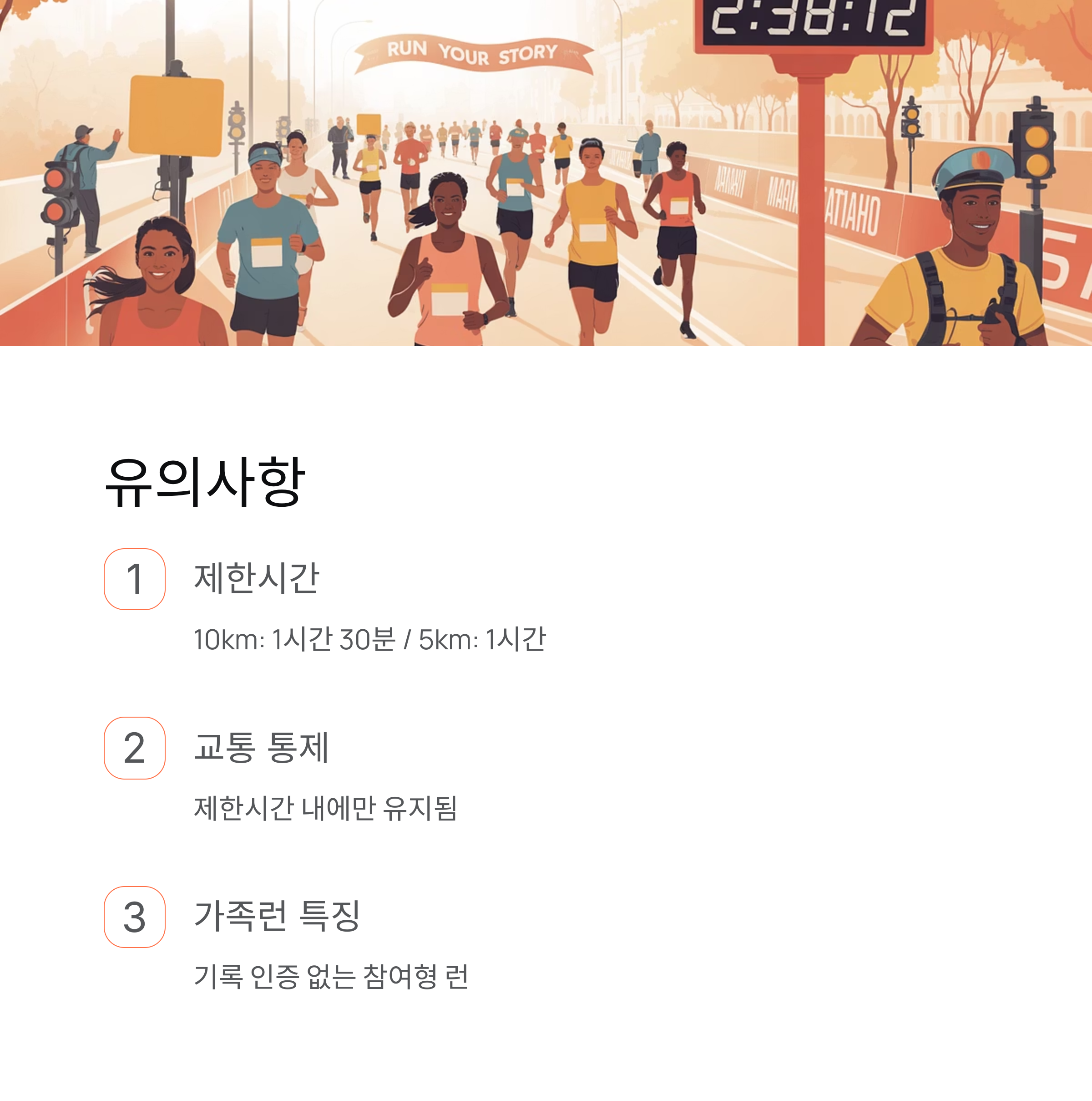 - 교통 통제는 제한시간 내에만 유지되므로 시간 내 완주 필요