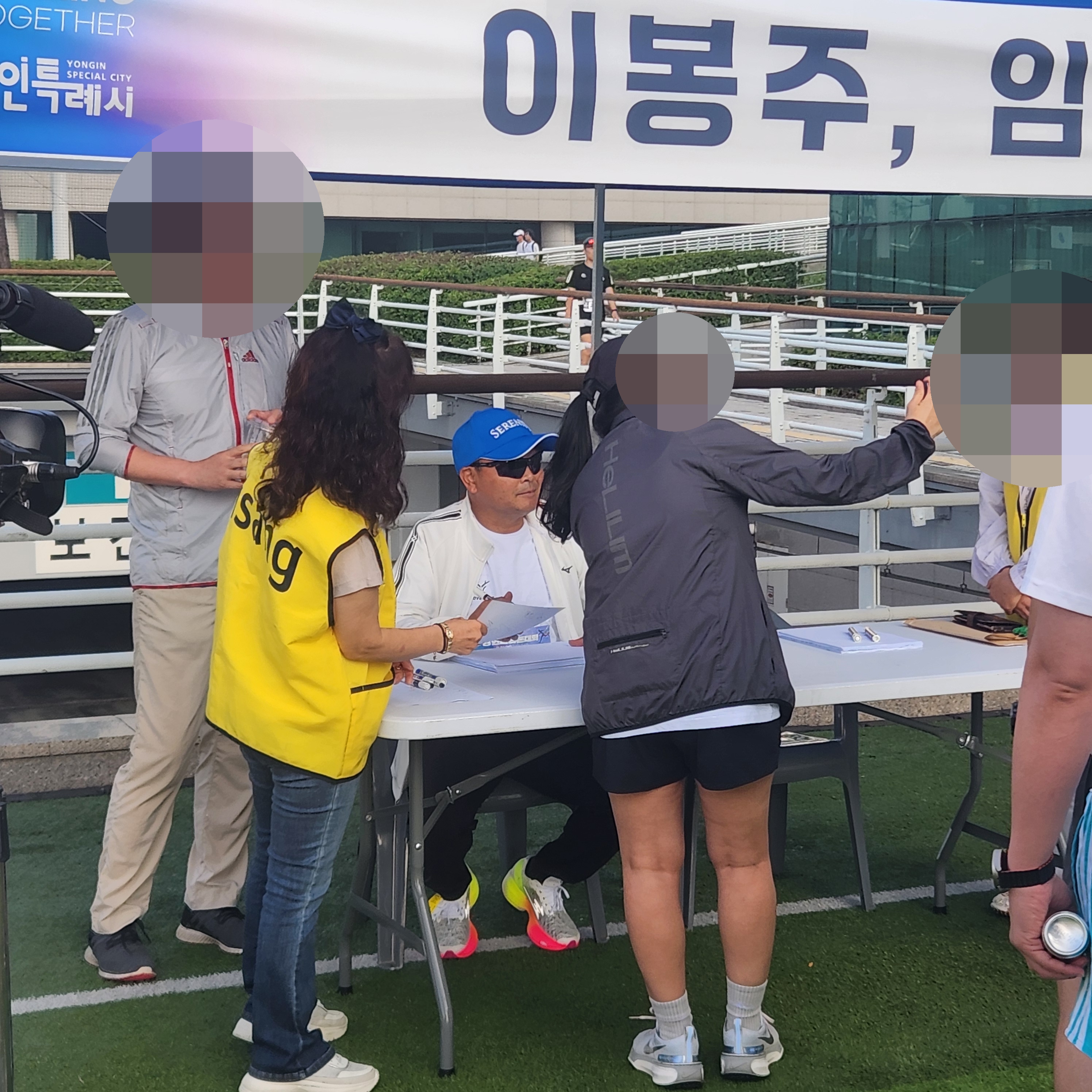 대회 당일 아침은 꽤 일찍 일어났어요. 용인 시청 앞이 출발지였는데, 이미 많은 참가자들로 붐비고 있었어요. 다양한 연령대의 사람들이 모여 있었고, 가족 단위 참가자도 많아 축제 분위기가 느껴졌답니다. 이봉주님도 보고 이런저런 이벤트도 있어서 구경도 하고 이른 시간인데도 이렇게 활기찬 행사가 가능하구나 하며 신기했어요.