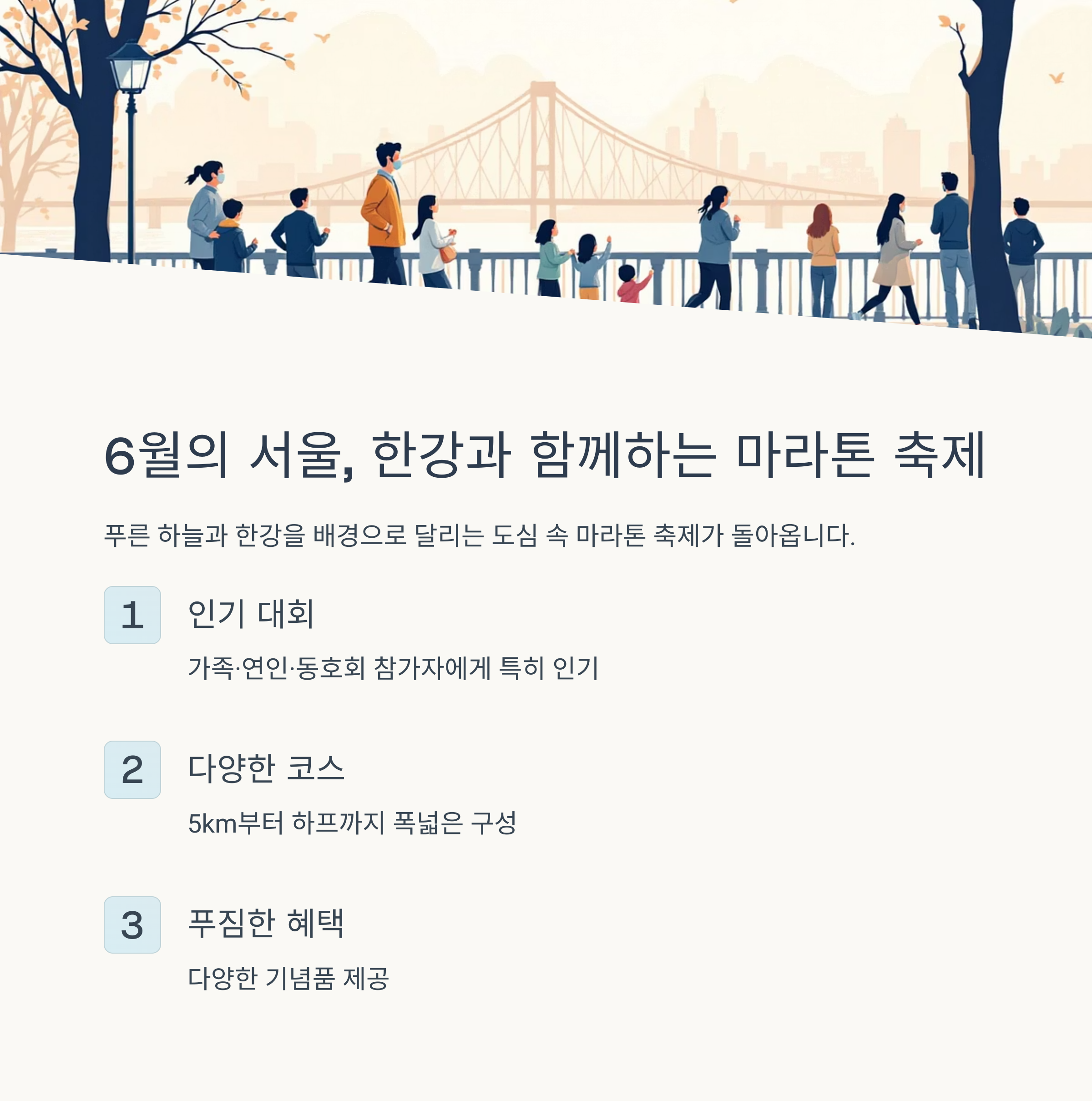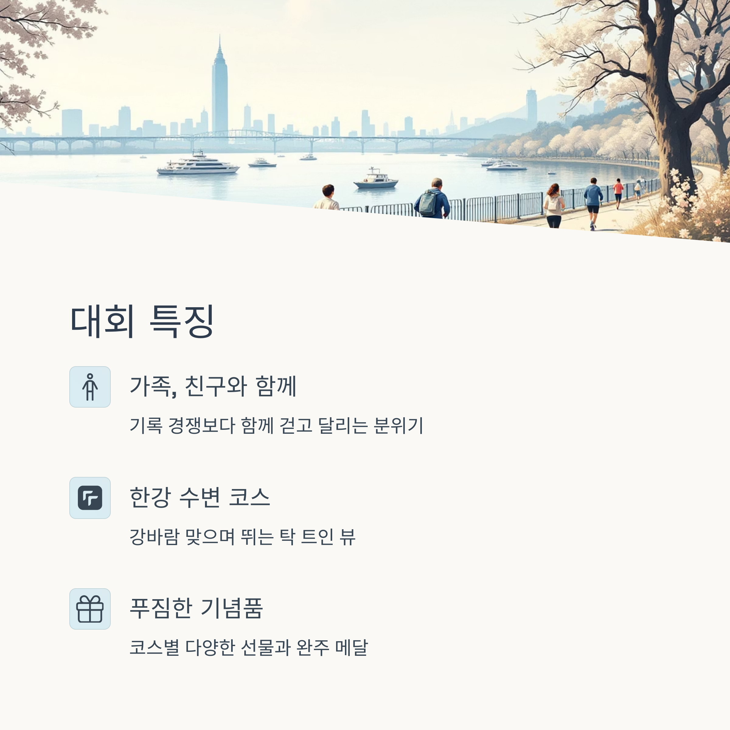 5km부터 하프까지 폭넓은 코스 구성과 다양한 기념품이 매력인 대회입니다.