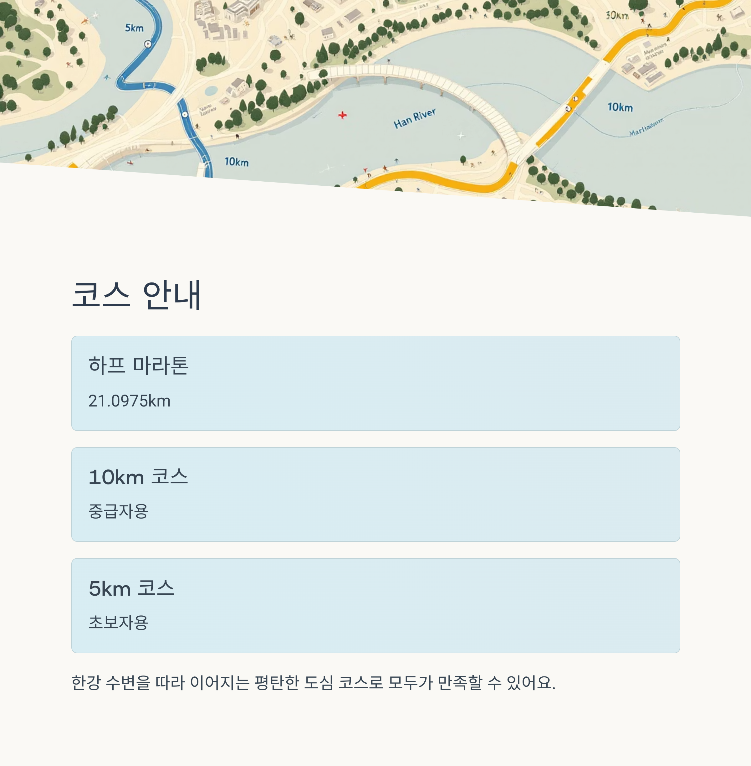 모든 코스는 한강 수변을 따라 이어지는 평탄한 도심 속 코스로, 초보자부터 숙련자까지 모두 만족할 수 있어요.