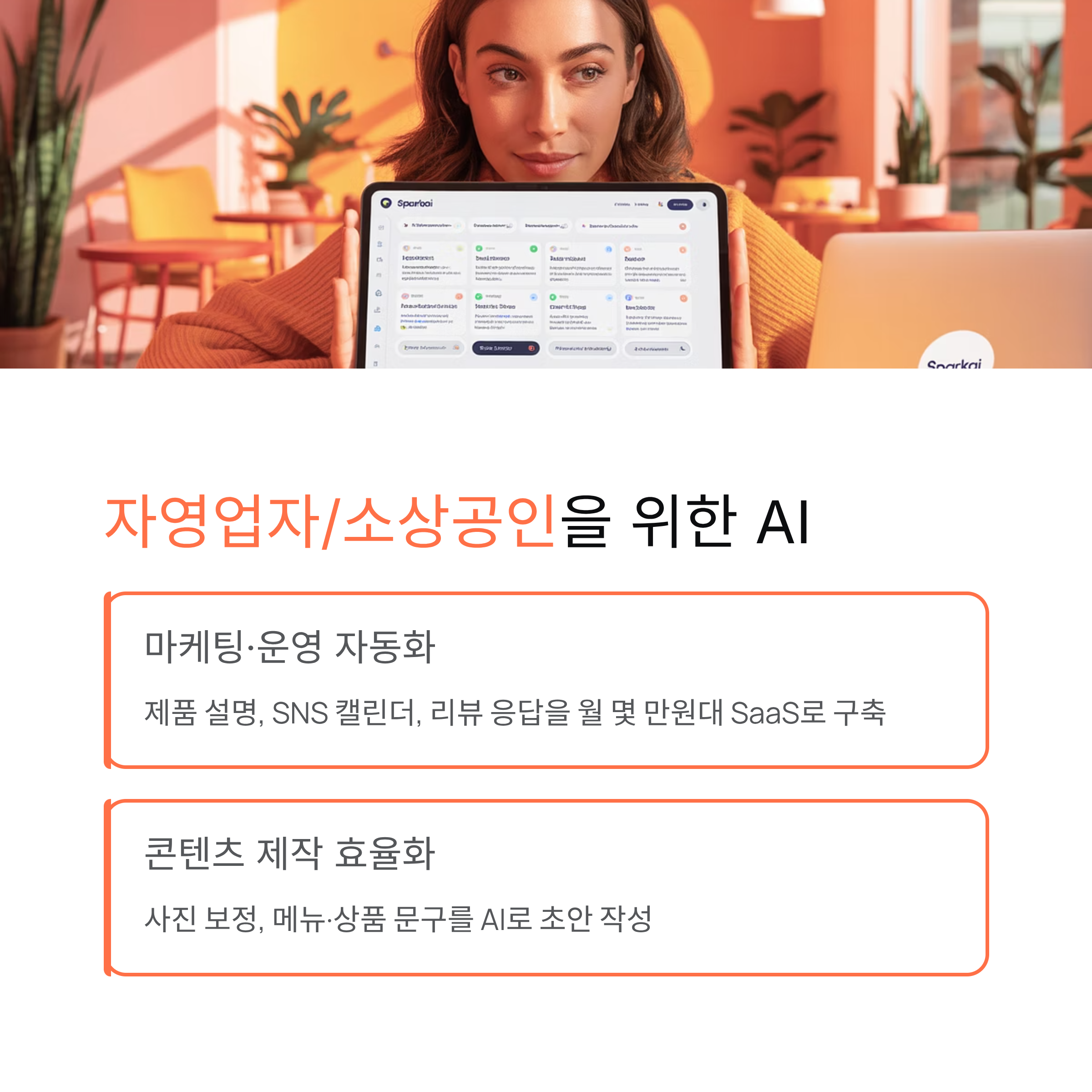 - 마케팅·운영 자동화가 핵심입니다. 제품 설명, SNS 캘린더, 리뷰 응답, 간단한 재고/수요 예측까지 소상공인도 월 몇 만원대 SaaS로 구축 가능합니다.