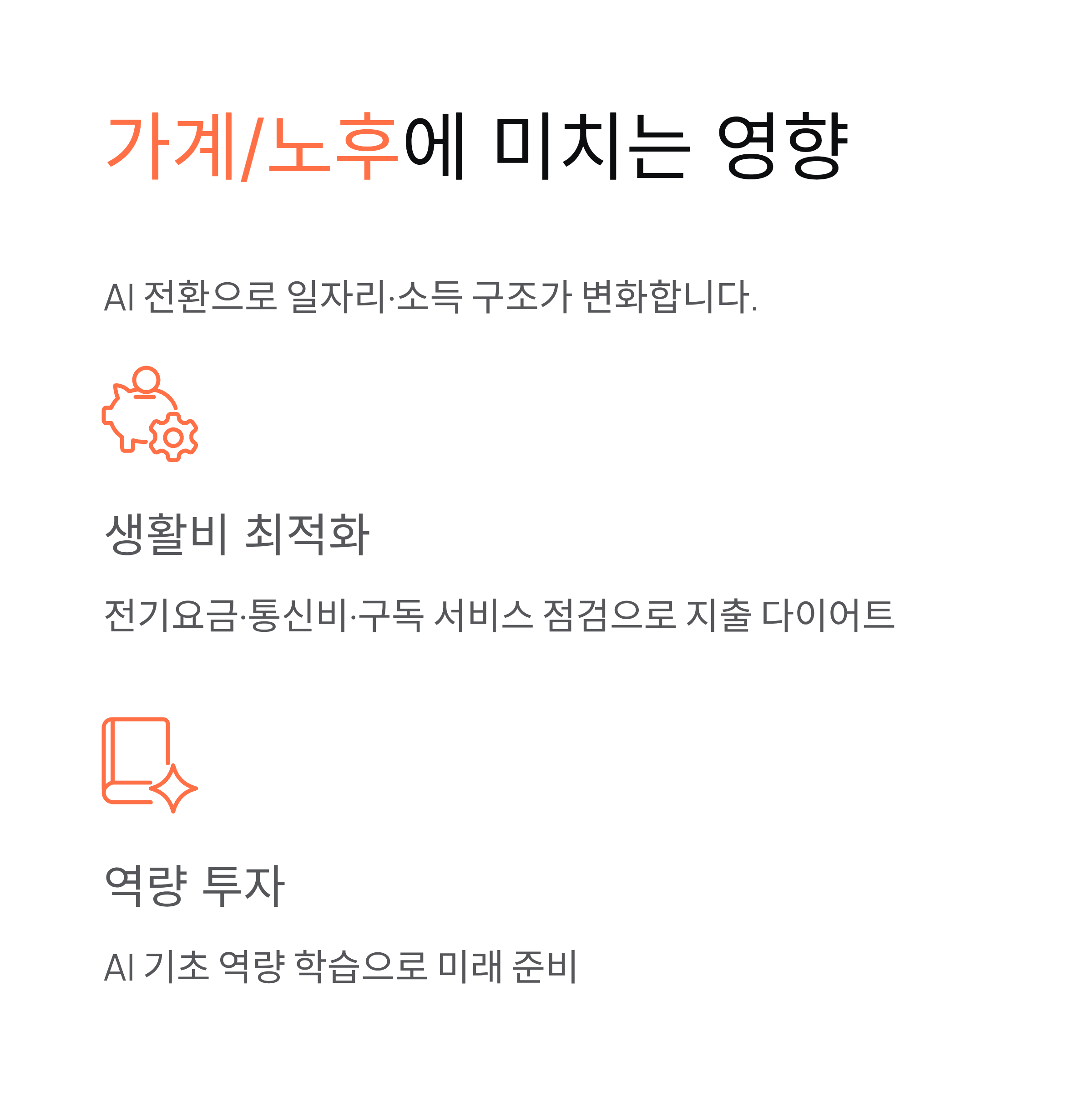 - 경기 둔화 속에서도 AI 전환으로 일자리·소득 구조가 바뀝니다. 지금부터 생활비 최적화 + 역량 투자의 이중 전략이 유효합니다.