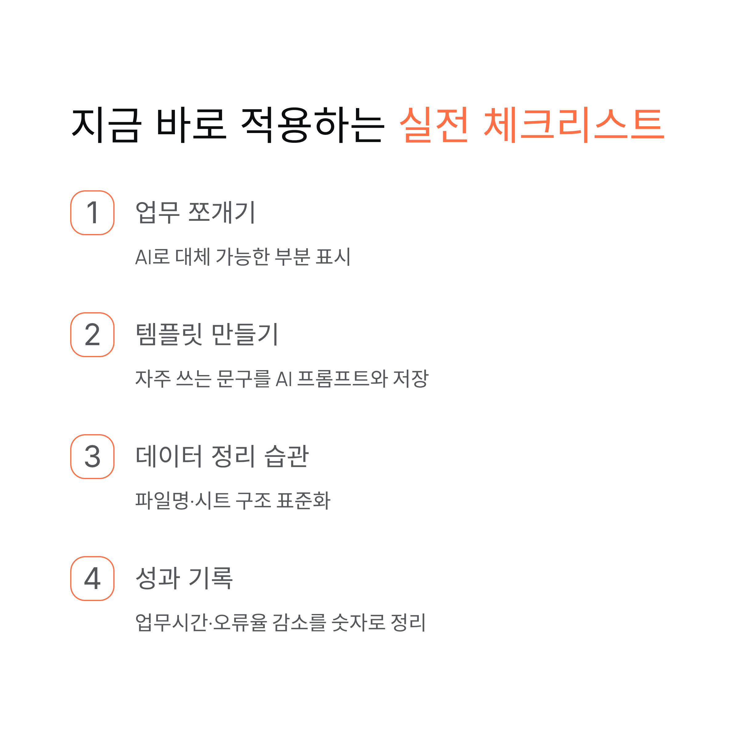 핵심은 “작게, 그러나 꾸준히” 적용하는 것입니다. 한 번에 큰 시스템을 도입하기보다, 반복 업무 1~2개부터 자동화해 성과를 체감해 보세요.