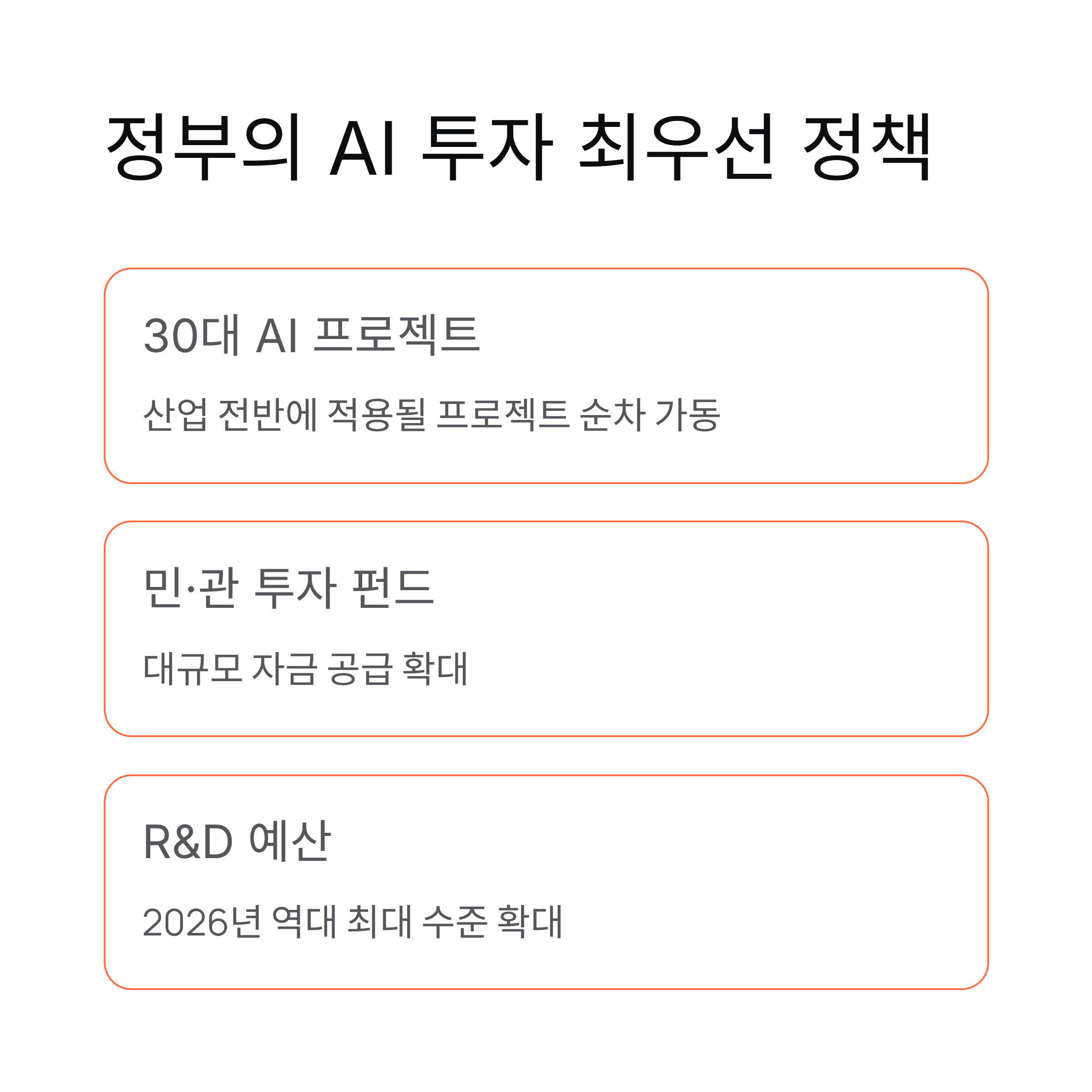 정부가 2025년 하반기부터 AI(인공지능) 투자를 최우선 과제로 추진하고, 산업 전반에 적용될 30대 AI 프로젝트를 순차적으로 가동하겠다고 밝혔습니다. 동시에 대규모 민·관 투자 펀드로 자금 공급을 확대하고, 2026년 연구개발(R&D) 예산도 역대 최대 수준으로 확대할 계획입니다.