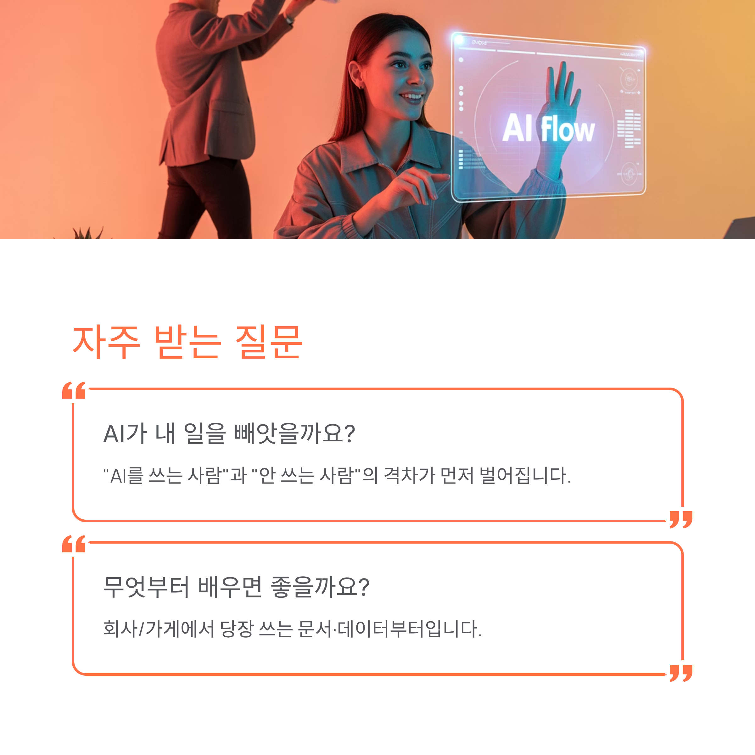 A. 단순 반복은 대체되지만, 문제 정의·품질 검수·관계 형성은 사람의 몫입니다. “AI를 쓰는 사람”과 “안 쓰는 사람”의 격차가 먼저 벌어집니다.