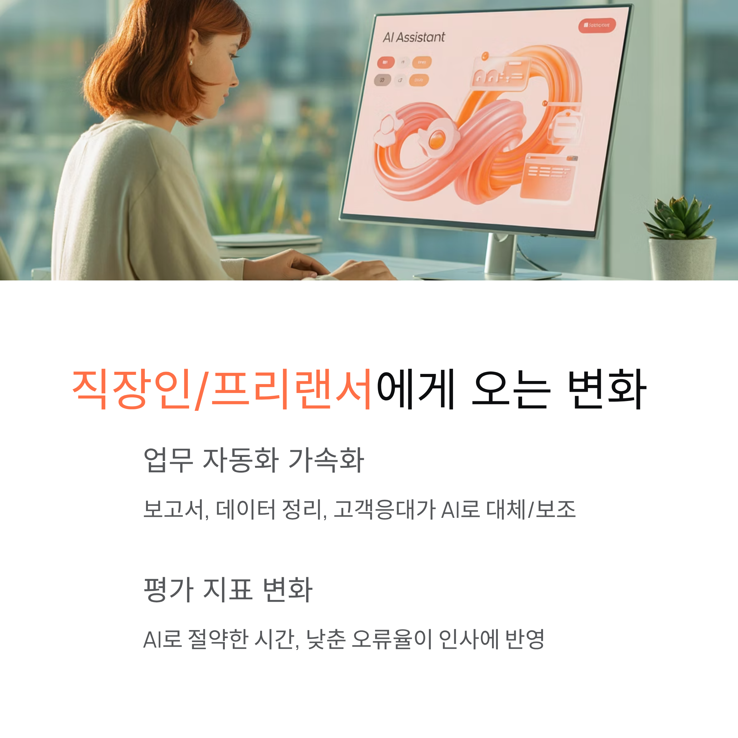 - 업무 자동화가 빨라집니다. 보고서 초안, 데이터 정리, 고객응대, 일정 관리, 품질점검 등 반복 업무가 AI+자동화 도구로 대체/보조됩니다.