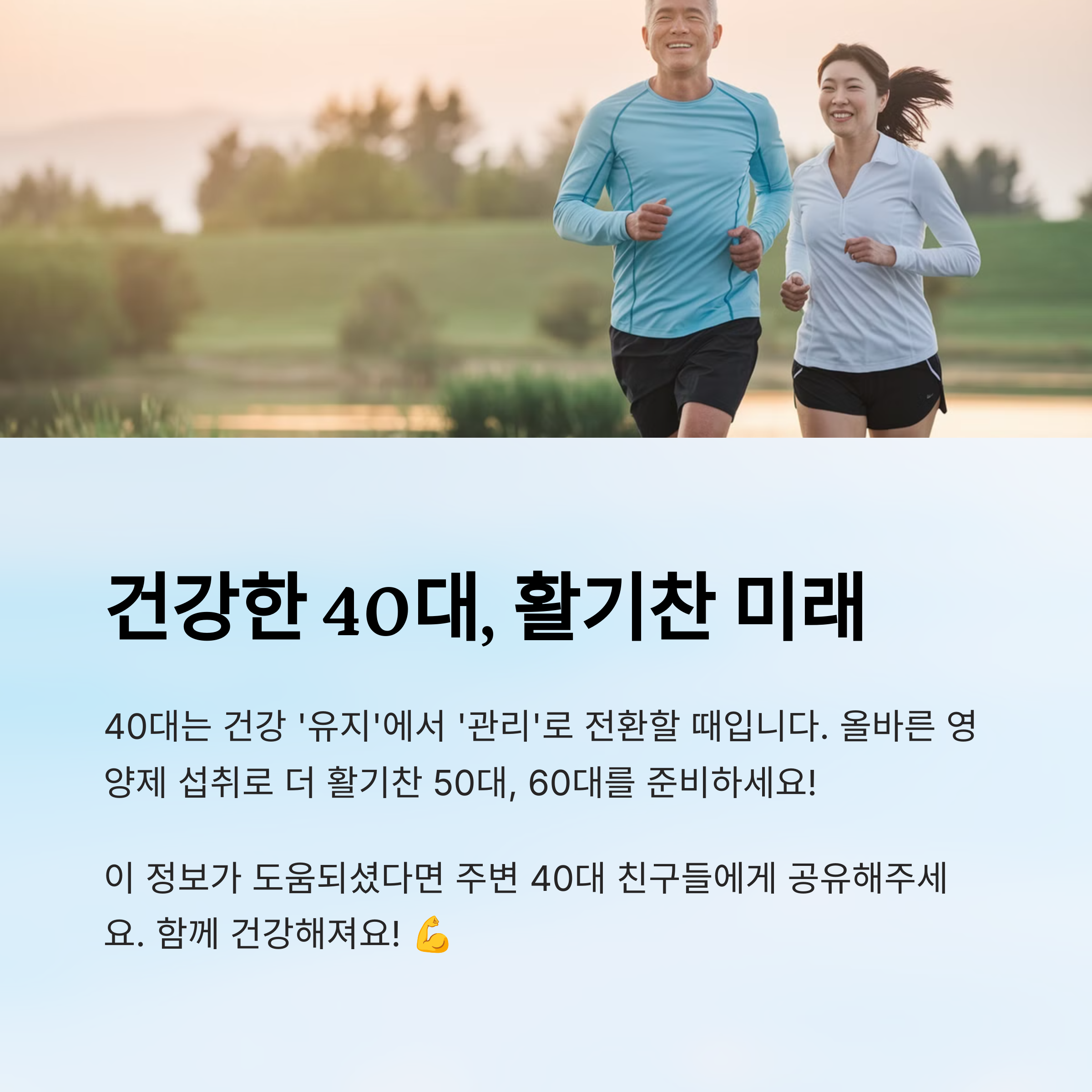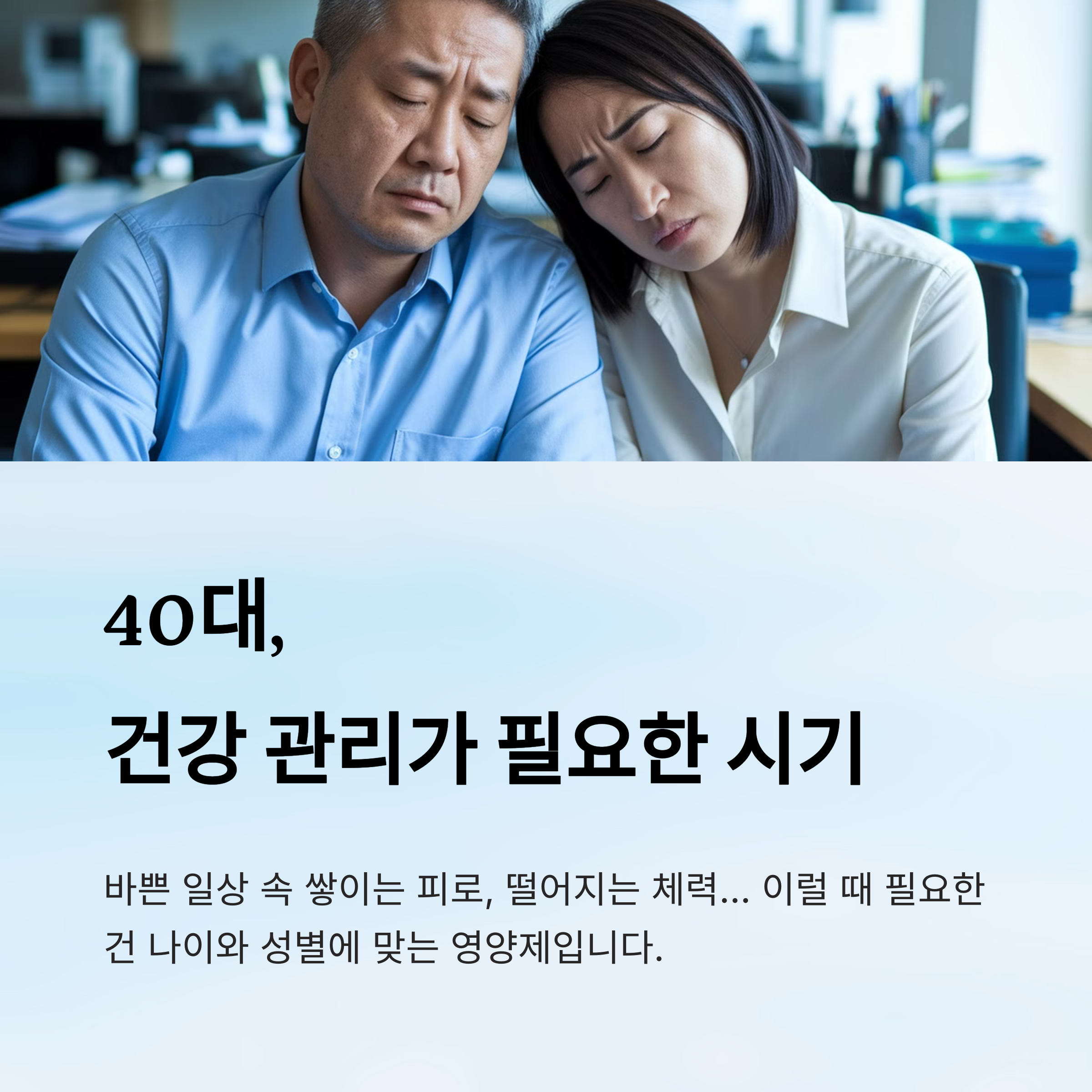 40대는 건강 관리의 방향을 '유지'에서 '관리'로 전환해야 할 때입니다. 몸에 필요한 영양소를 꾸준히, 그리고 올바르게 챙긴다면 더 활기찬 50대, 60대를 준비할 수 있어요.