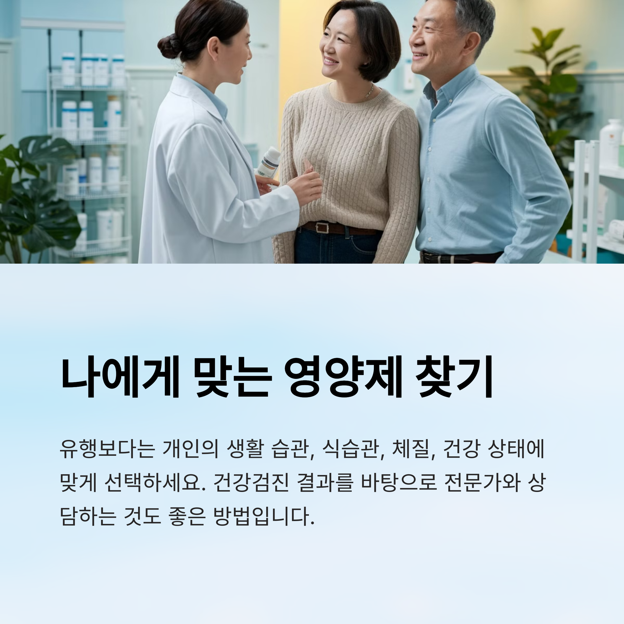 영양제는 개인의 생활 습관, 식습관, 체질, 건강 상태에 따라 달라져야 합니다. 무조건 ‘유행하는’ 제품을 따르기보다는 본인의 피로도, 소화 상태, 활동량 등을 고려해 선택하세요.