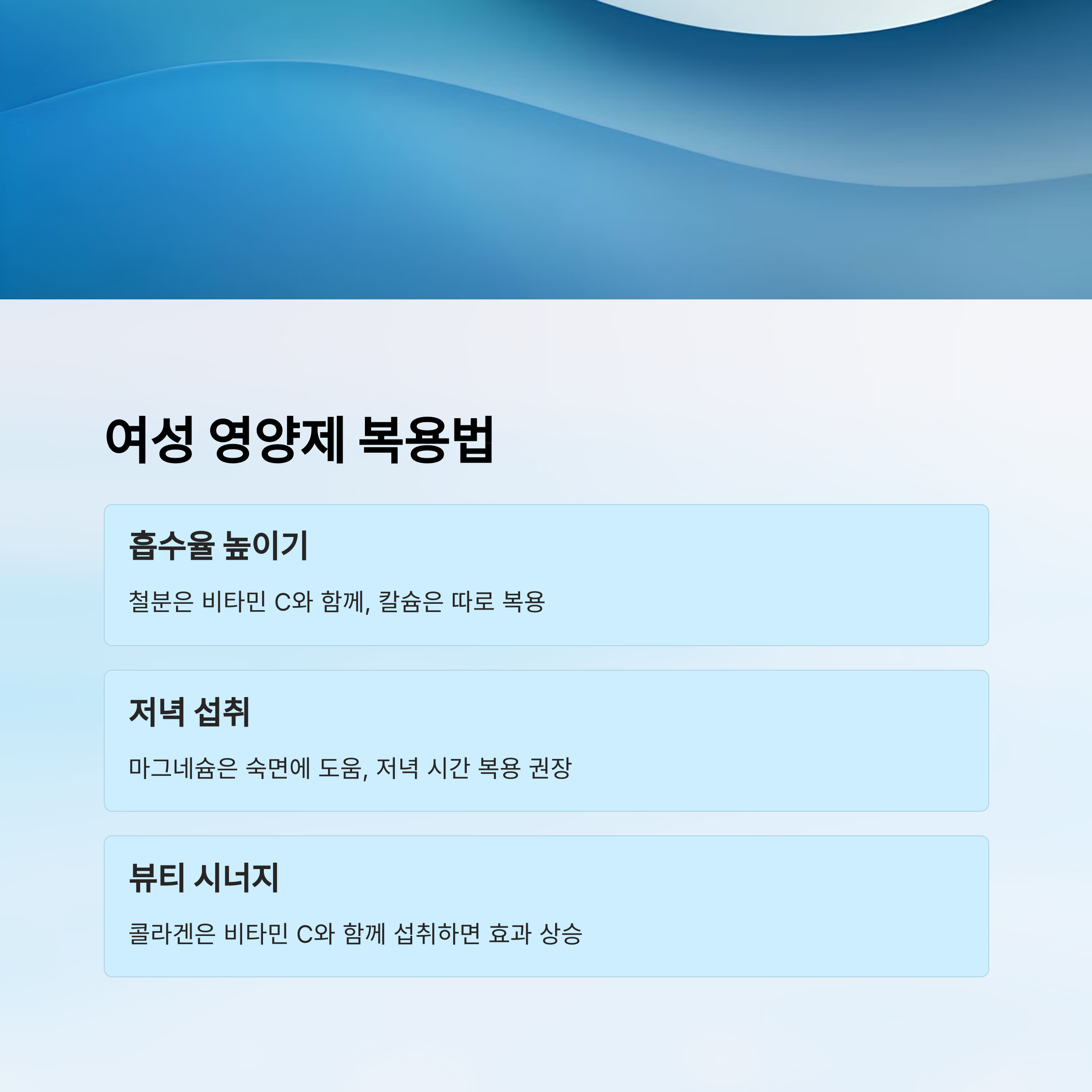 여성은 칼슘과 철분의 섭취 간격을 꼭 둬야 해요. 철분은 비타민 C와 함께, 칼슘은 따로 드시는 것이 흡수에 좋습니다. 또한 마그네슘은 숙면에도 도움을 줄 수 있으니 저녁 복용이 좋아요.