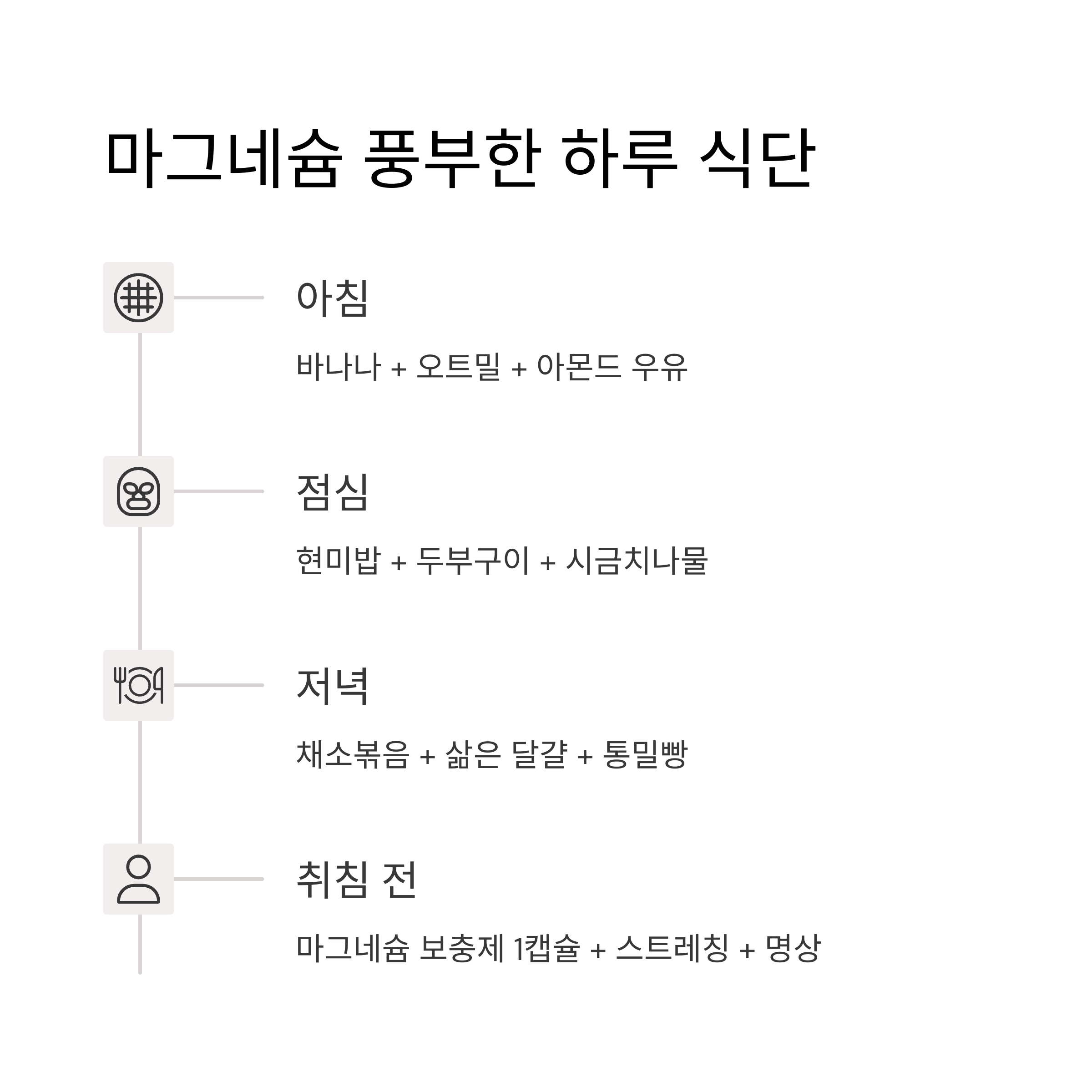 - ✔ 저녁 식사 1시간 후: 마그네슘 보충제 1캡슐 섭취