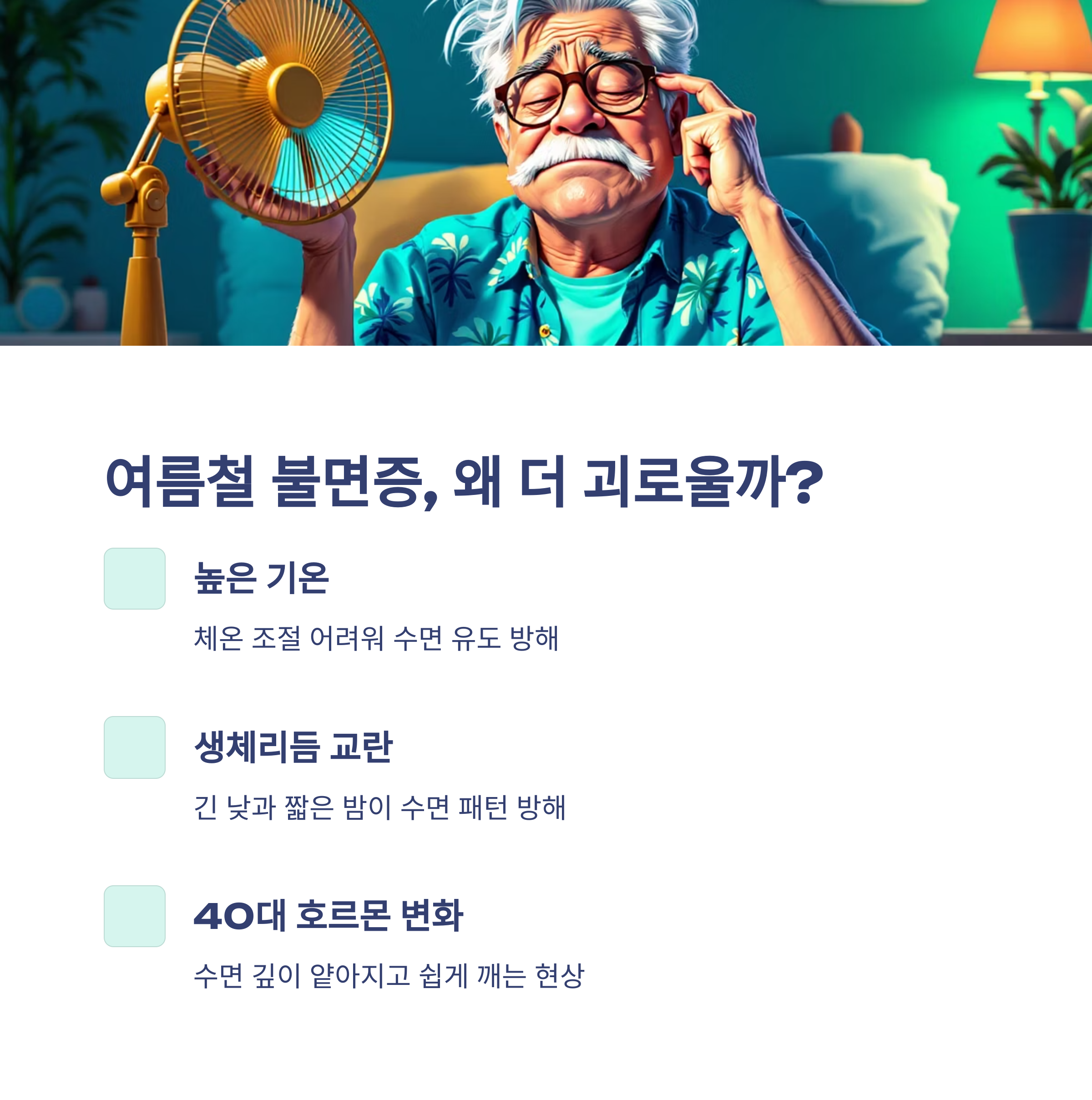 40대 이후 여름 불면증은 습관과 환경, 식단을 총체적으로 관리해야 극복할 수 있습니다.