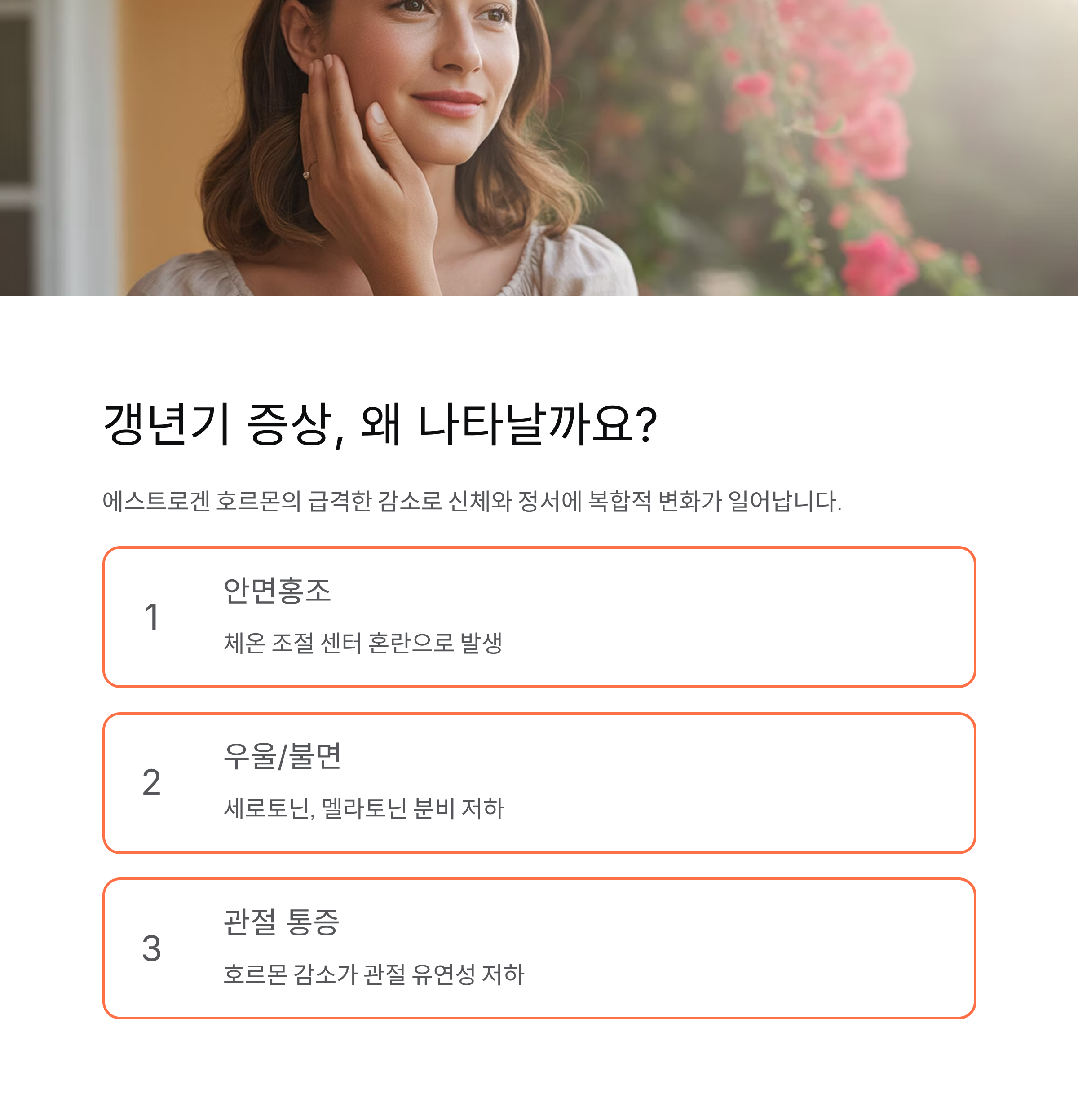 사실 대부분의 여성은 45세 전후로 갱년기의 전조 증상을 겪게 됩니다. 하지만 명확하게 갱년기인지, 단순 피로인지 구별이 어려워 시기를 놓치거나 방치하는 경우가 많죠.