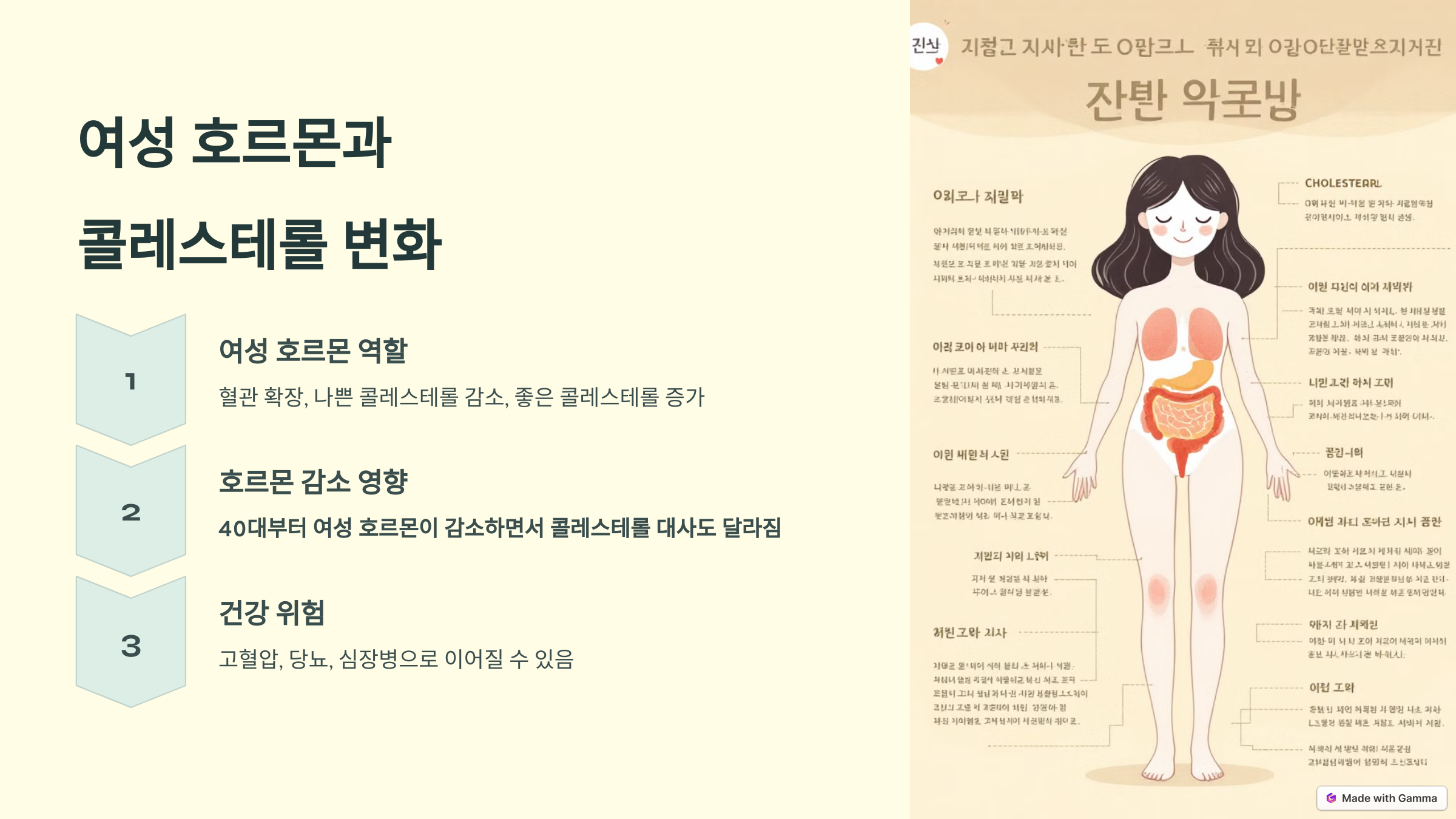 여성 호르몬은 혈관을 확장하고, 나쁜 콜레스테롤을 줄이며 좋은 콜레스테롤을 늘리는 역할을 합니다. 하지만 40대부터 여성 호르몬이 감소하면서 콜레스테롤 대사도 달라지게 되죠.