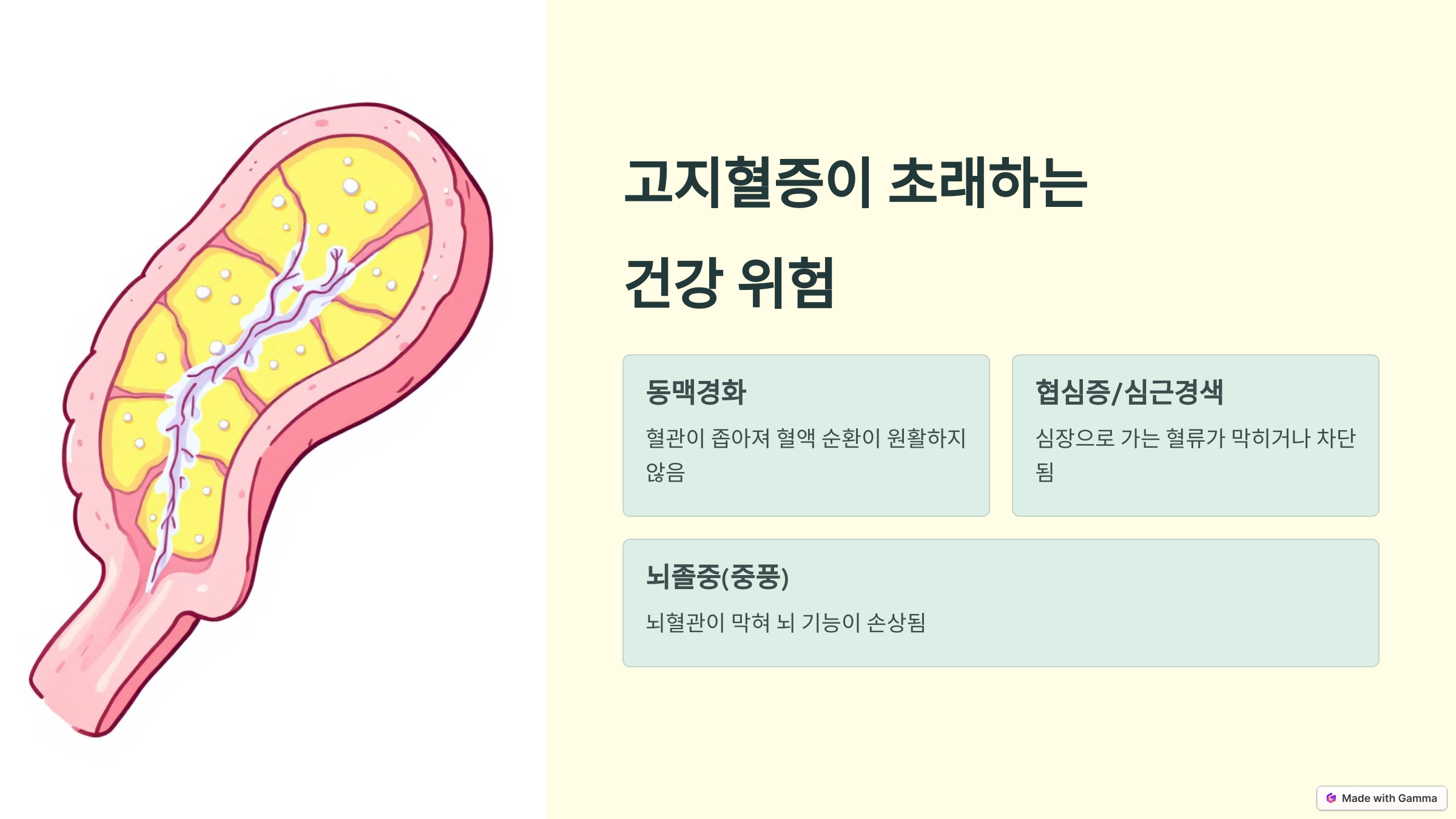 고지혈증은 단순히 '콜레스테롤 수치가 높다'는 것이 아닙니다. 지속되면 혈관 벽에 지방이 쌓여 동맥경화, 심장병, 뇌졸중 등의 위험이 커지게 되죠. 특히 40대 이후 여성은 갱년기 이후 급격한 혈관 노화가 진행되기 때문에 더욱 주의해야 합니다.