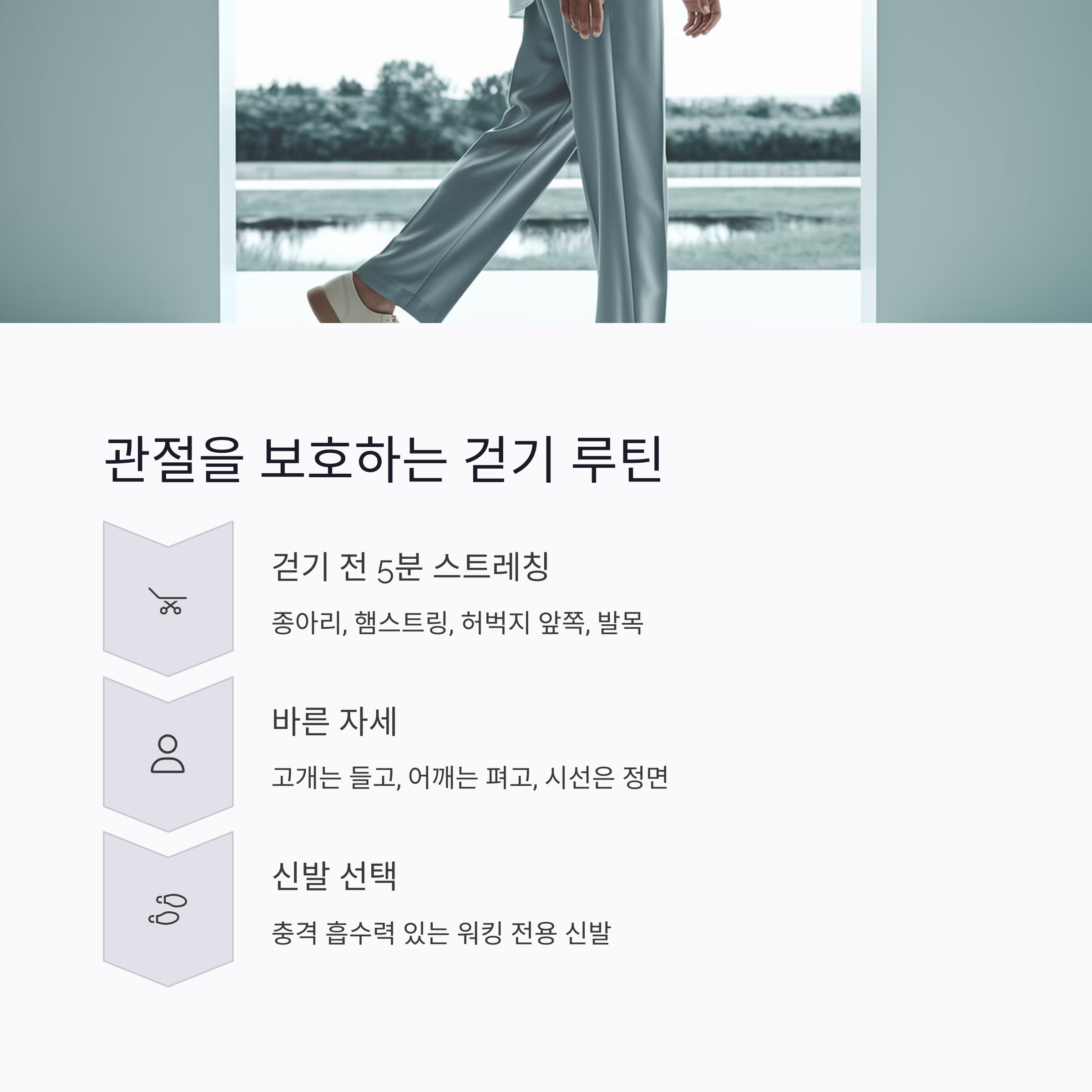 오늘은 관절 건강을 지키면서 걷기 운동을 안전하게 이어가는 루틴을 소개합니다.