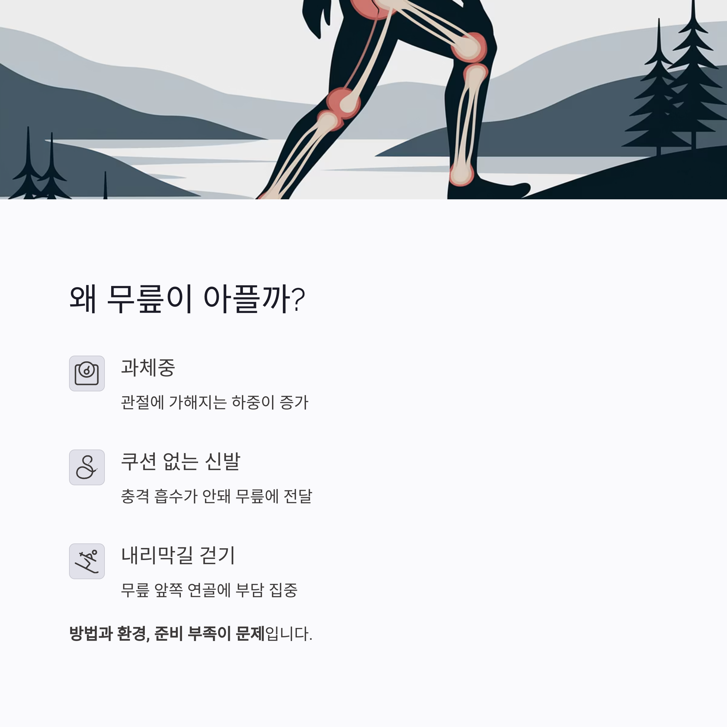 - 쿠션 없는 신발: 충격 흡수가 안돼 무릎에 전달