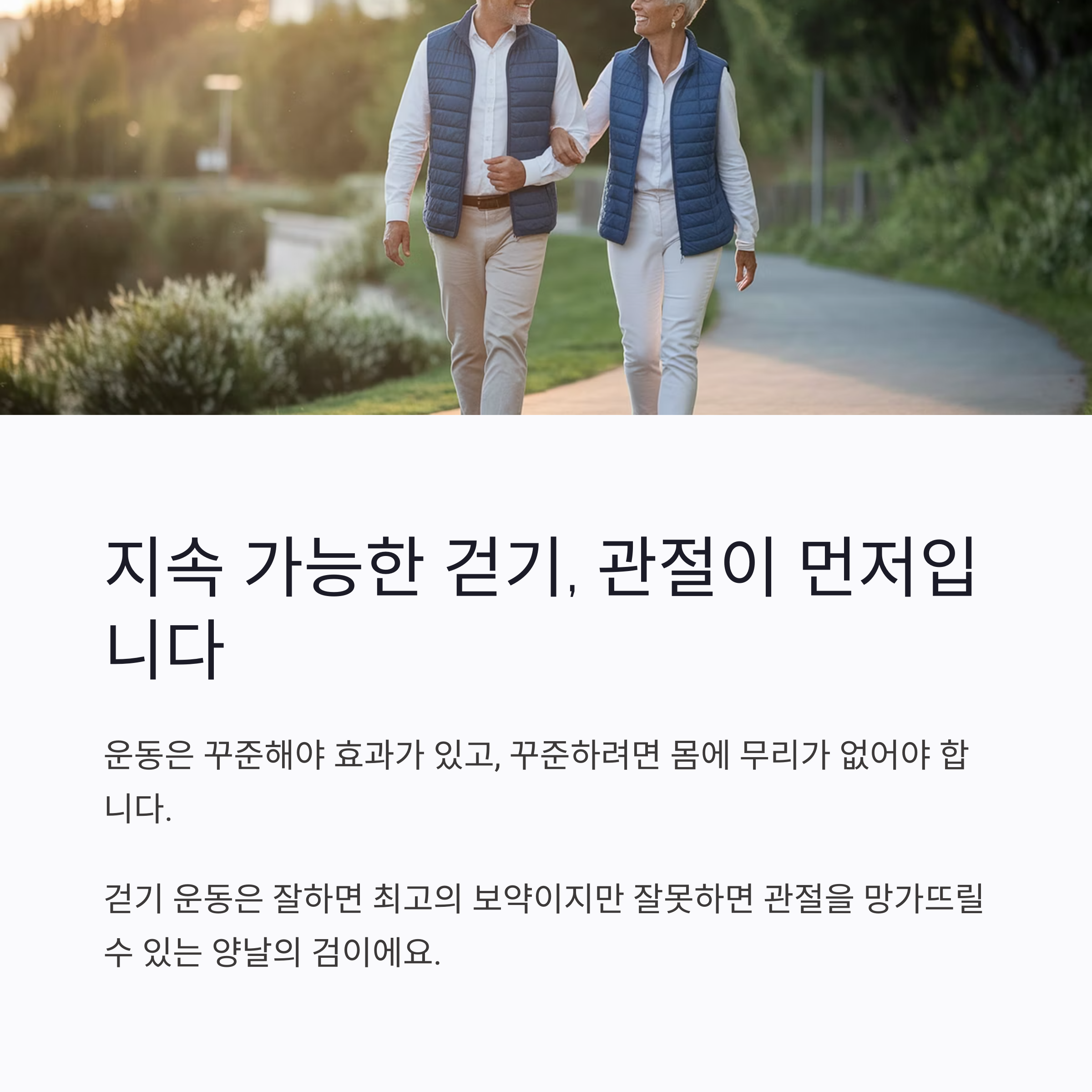 오늘부터는 관절을 위한 걷기 루틴으로 바꿔보세요. 몸이 더 편안하고, 운동도 더 즐거워질 거예요.