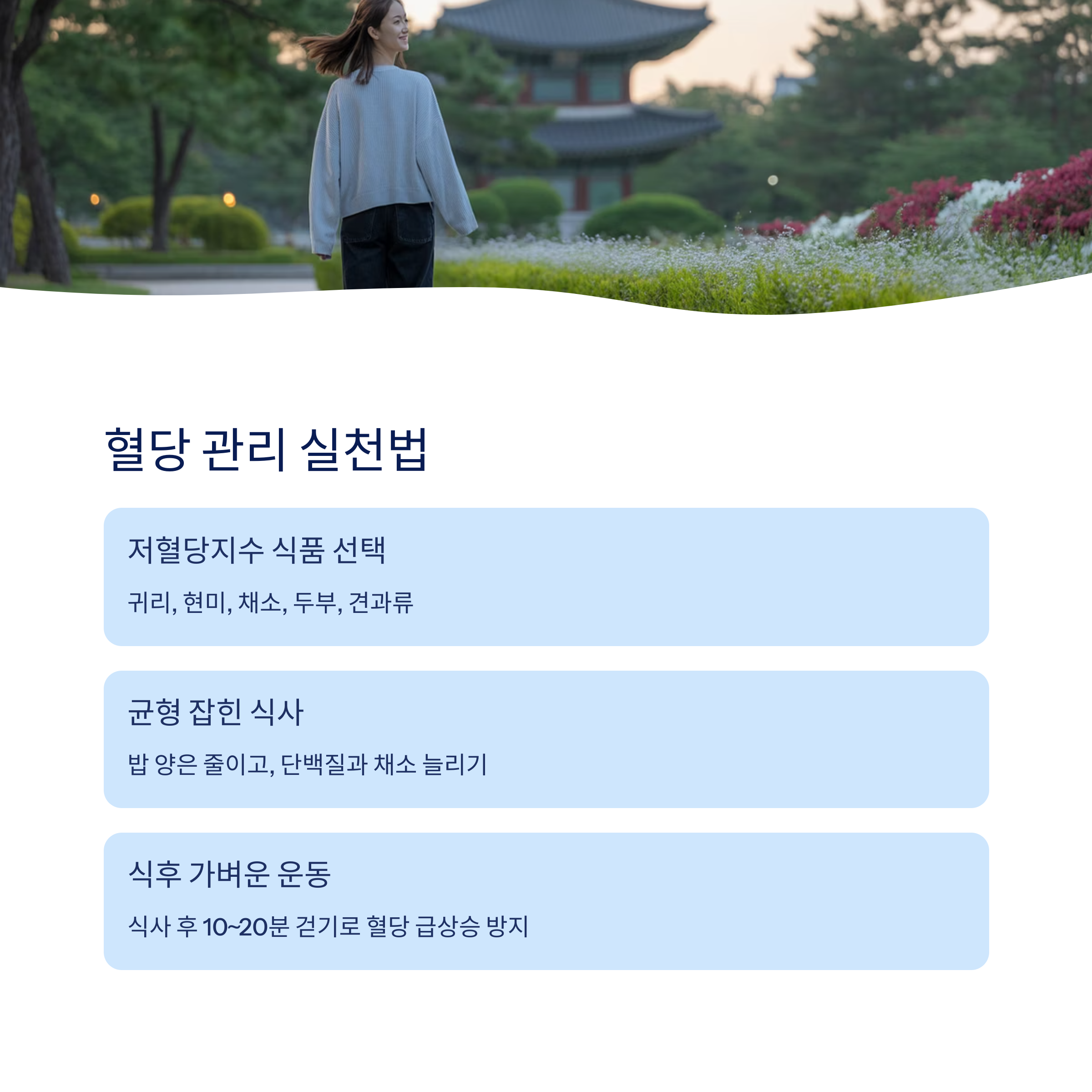 - 식후 가벼운 운동: 식사 후 10~20분 걷기 등은 혈당 급상승을 막는 데 효과적입니다.