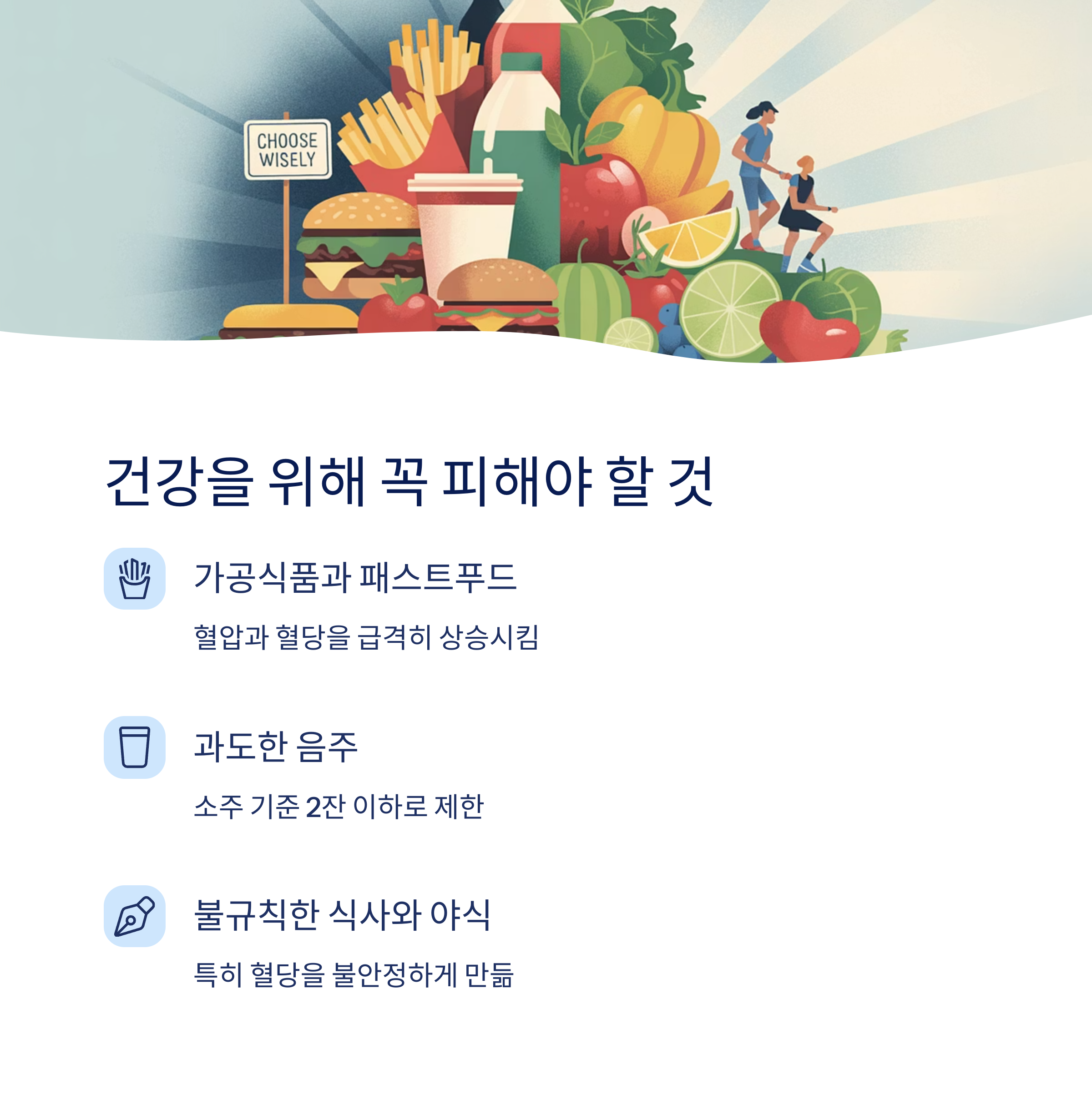 - 가공식품, 패스트푸드, 단 음료, 짠 음식 – 혈압과 혈당을 급격히 상승시킵니다.